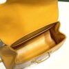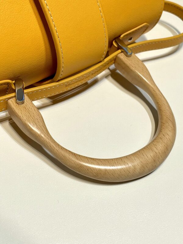 부드러운 나무 손잡이와 함께 코튼 린넨 소재와 가죽이 조화를 이루어 고급스러운 느낌을 줍니다. 내부는 밝은 노란색 소가죽으로 마감되어 있어 세련된 포인트를 더합니다.