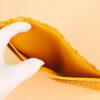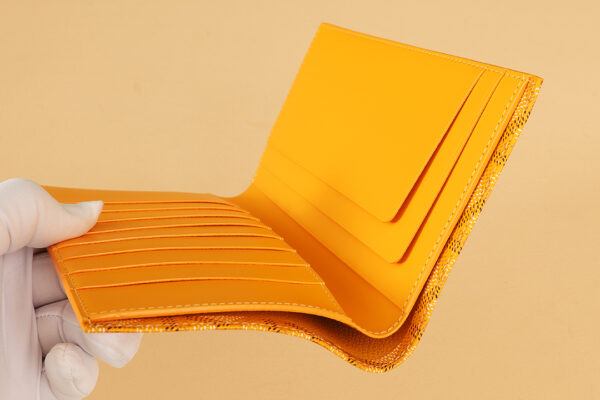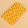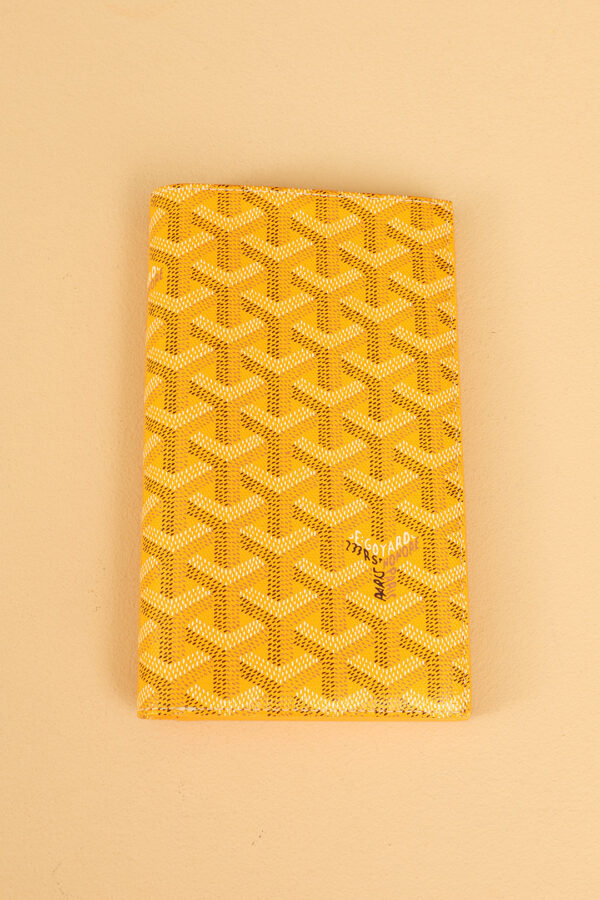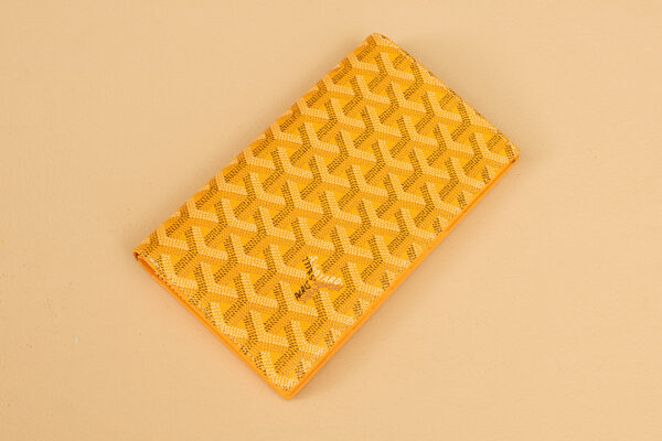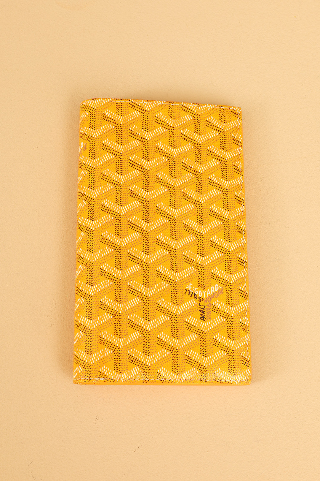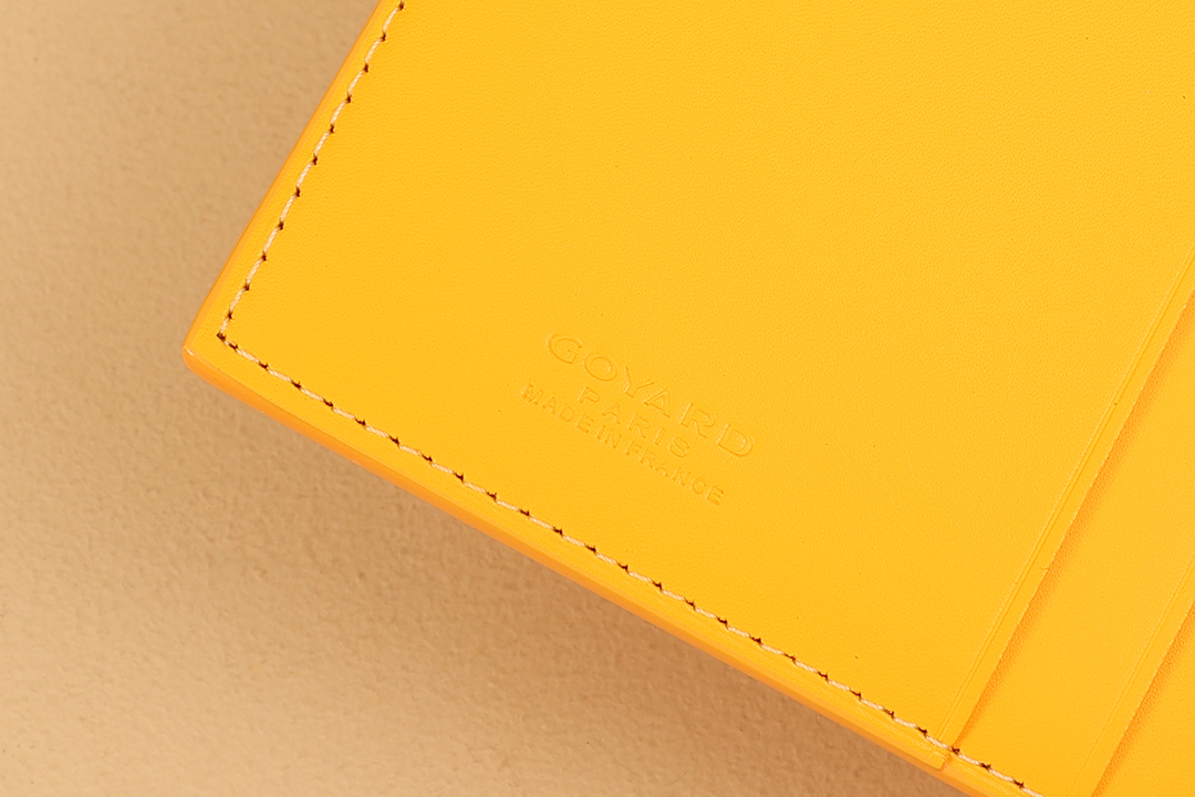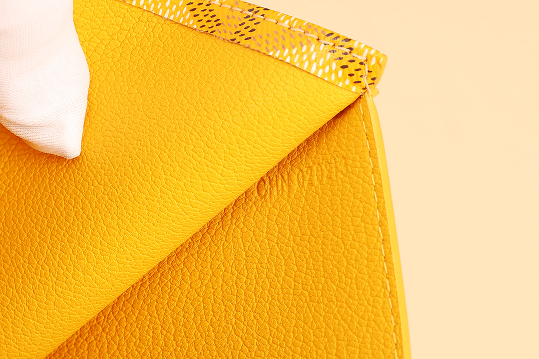 고야드의 기내 수납 클러치는 브라질 소가죽과 클래식한 캔버스 패턴으로 제작되었습니다.