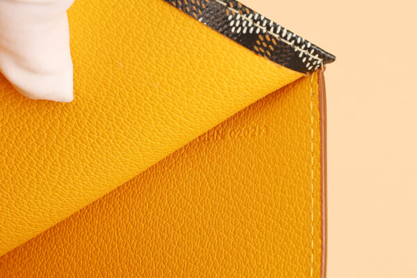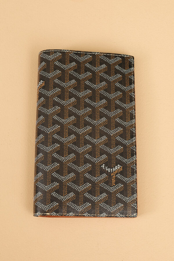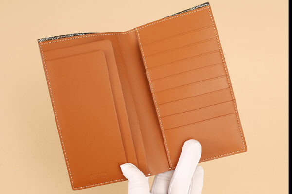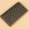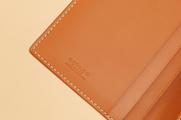 고야드의 기내 탑승권 지갑은 브라질 소가죽과 클래식한 캔버스 패턴이 조화를 이루어 세련된 느낌을 줍니다.