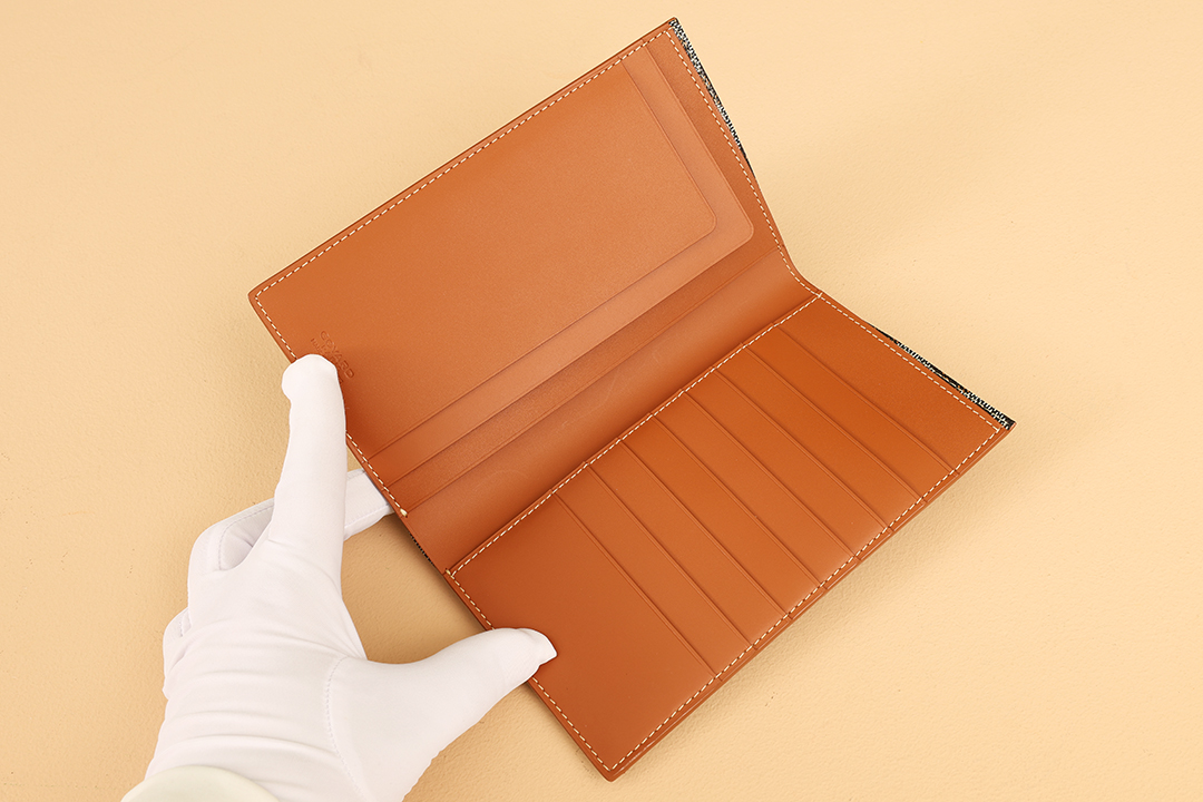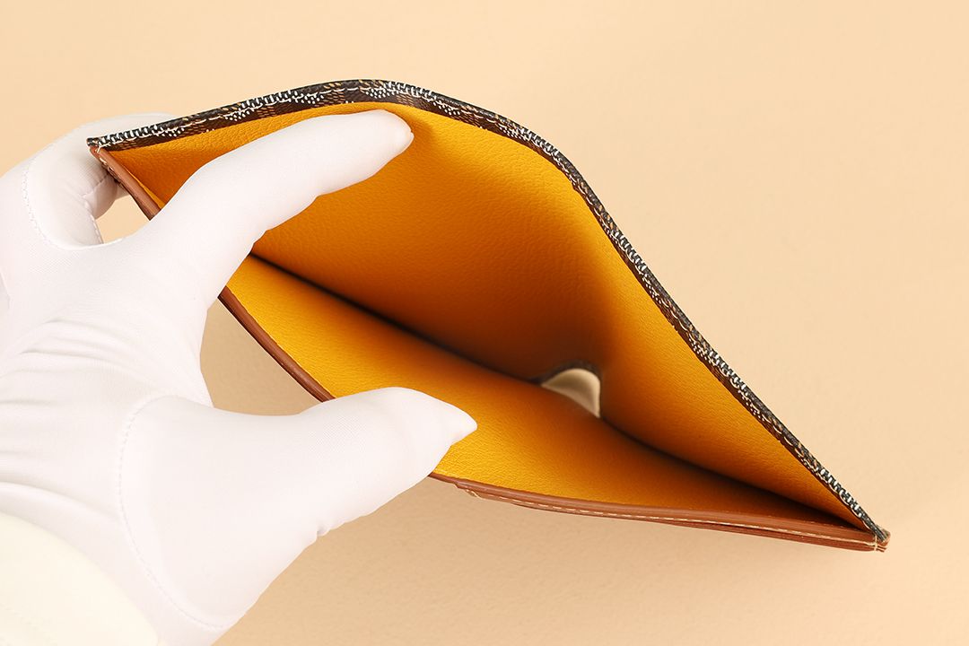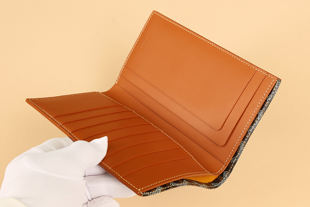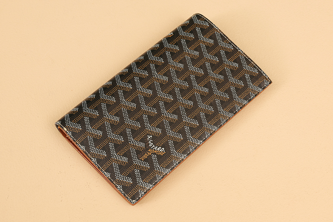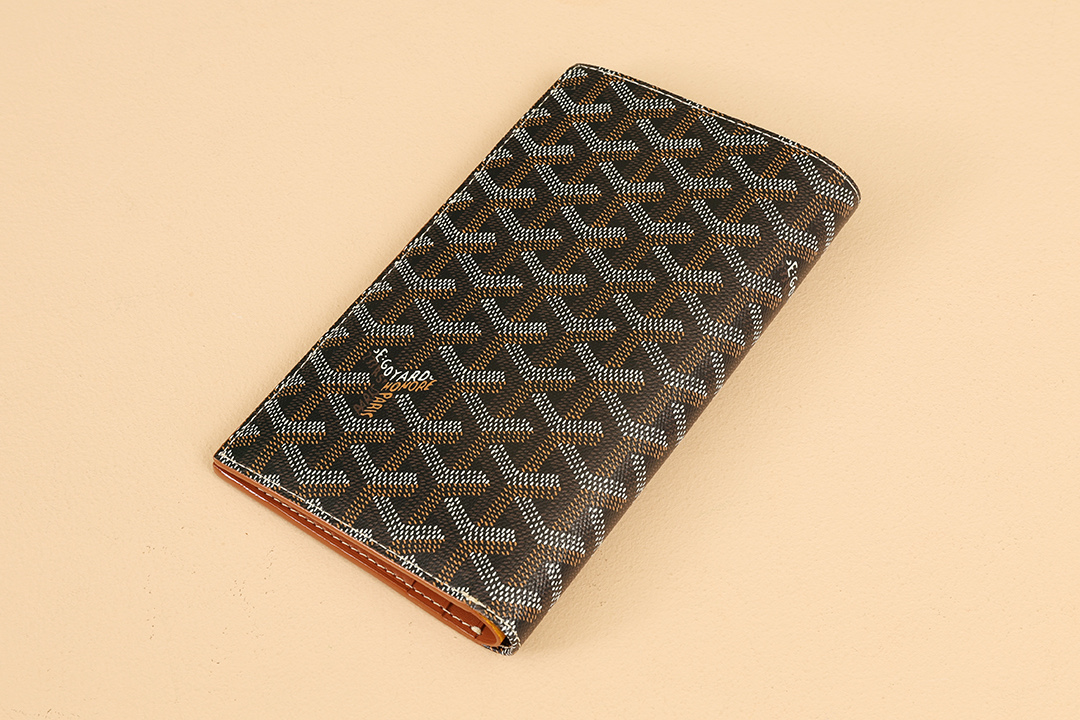 고야드의 기내 탑승권 지갑은 브라질 소가죽과 클래식한 캔버스 패턴이 조화를 이루어 세련된 느낌을 줍니다.