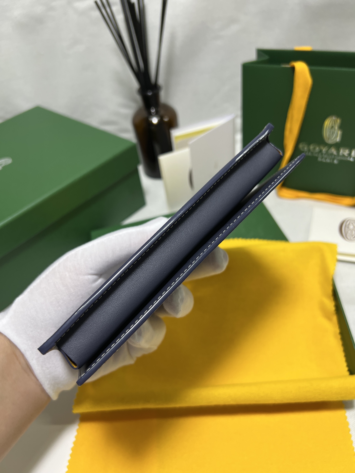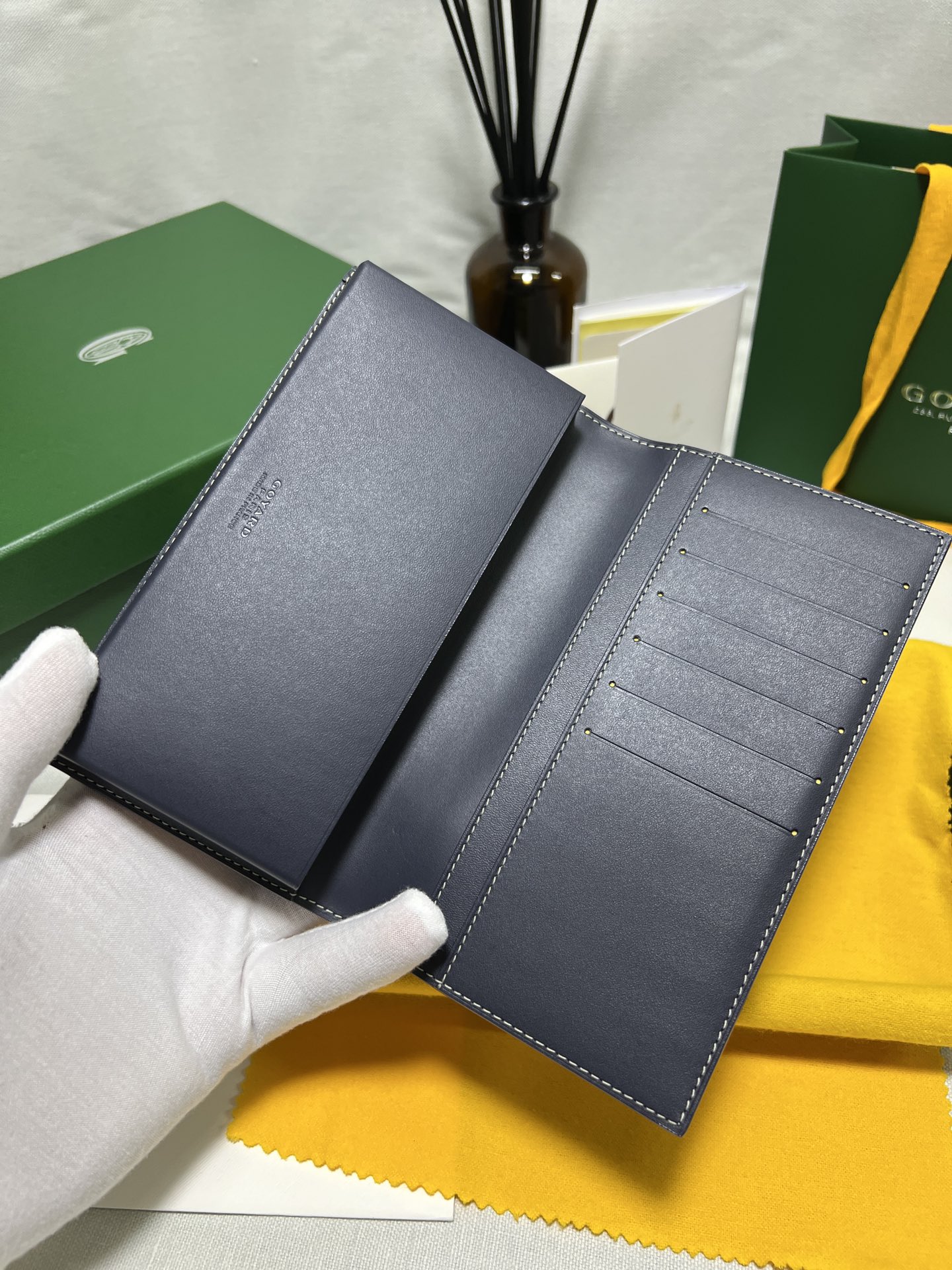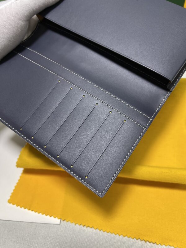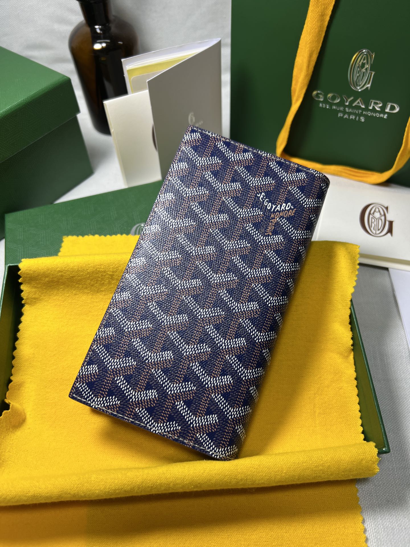 고야드의 롱 핸드폰 지갑은 작고 정교한 디자인으로, 마치 하나의 예술 작품과 같습니다. 브랜드의 우아함과 고급스러움이 잘 드러납니다.