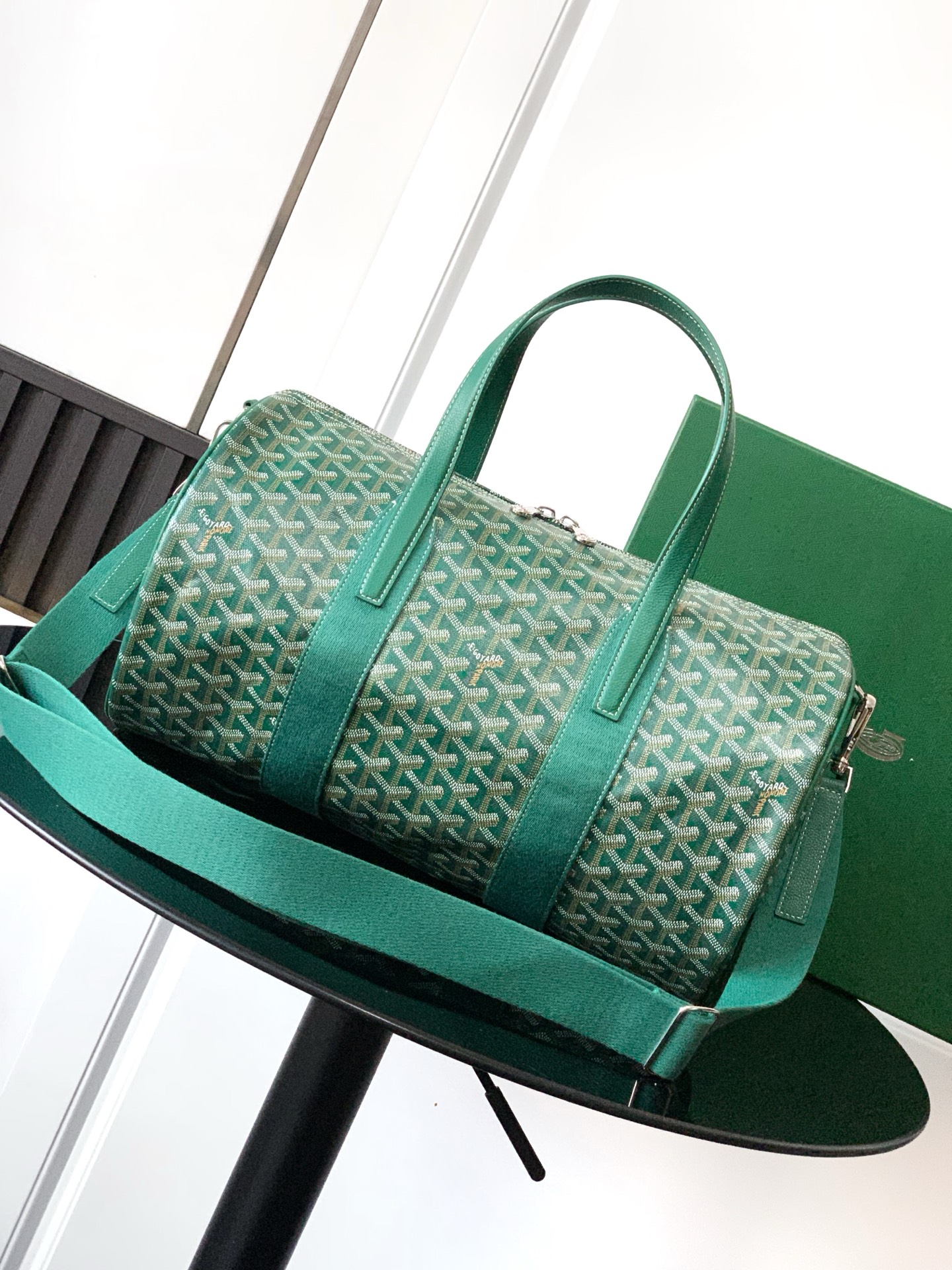 가방 중앙에는 두 개의 손잡이가 있으며, 측면에는 하나의 손잡이가 있어 손으로 들거나 중간 크기의 어깨 끈을 추가하여 어깨에 메거나 크로스백으로 착용할 수 있습니다.