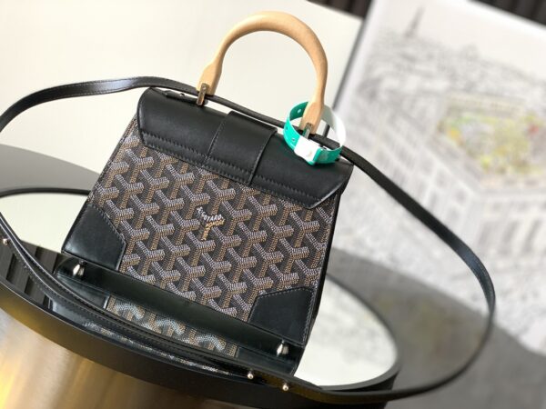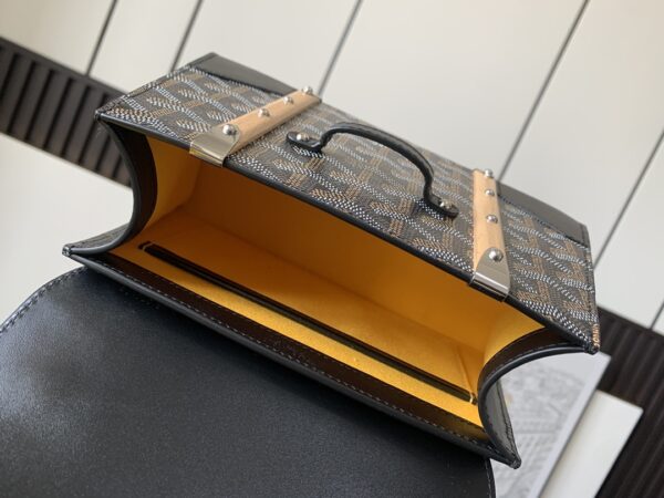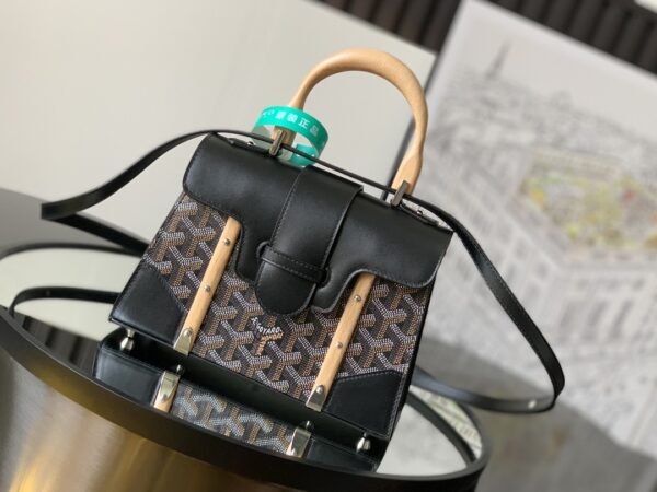 고야드의 사이공 미니백은 브랜드의 독창적인 제상 공예를 잘 보여주는 아이템입니다. 나무, 보호대, 가죽 모서리, 제상 못 등 다양한 요소가 조화를 이루어 고급스러운 매력을 발산합니다.