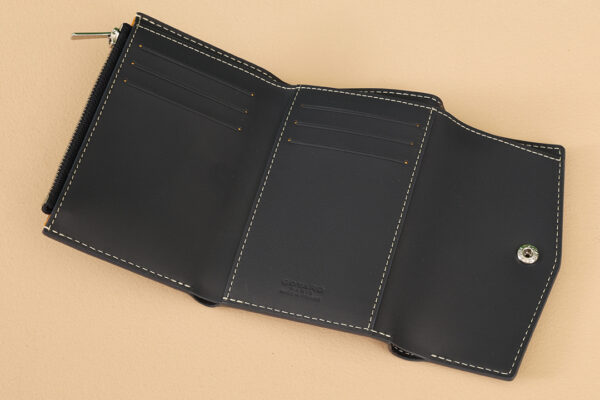 지갑 전면에는 안전하게 물건을 보관할 수 있는 버튼 잠금이 있어 실용성을 더했습니다.