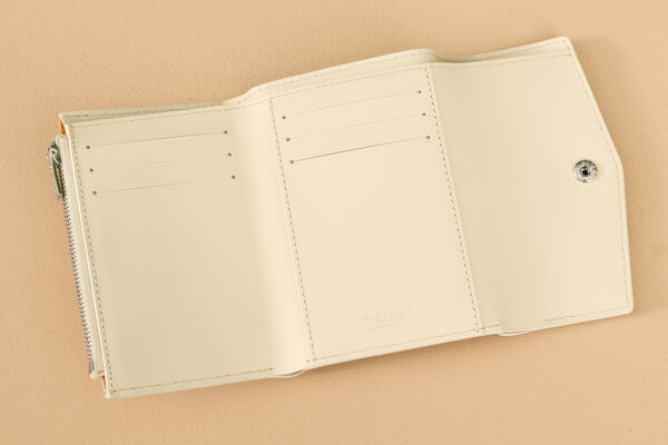 지갑은 세 겹으로 열리며, 7장의 카드, 지폐, 동전 및 다양한 증명서를 수납할 수 있는 공간을 제공합니다.