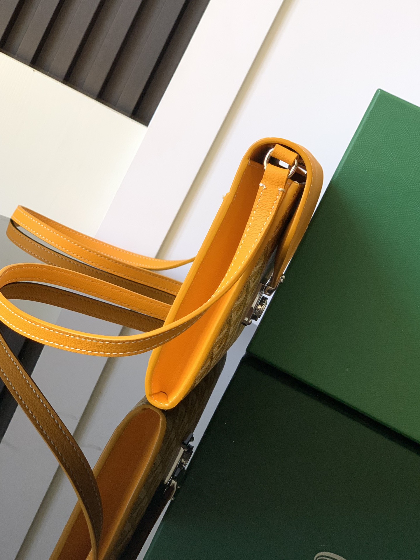 내부에는 6개의 카드 슬롯이 있어 소지품을 깔끔하게 정리할 수 있습니다. 또한, 탈부착이 가능한 조절 가능한 가죽 어깨끈이 있어 다양한 착용 방식으로 활용할 수 있습니다.