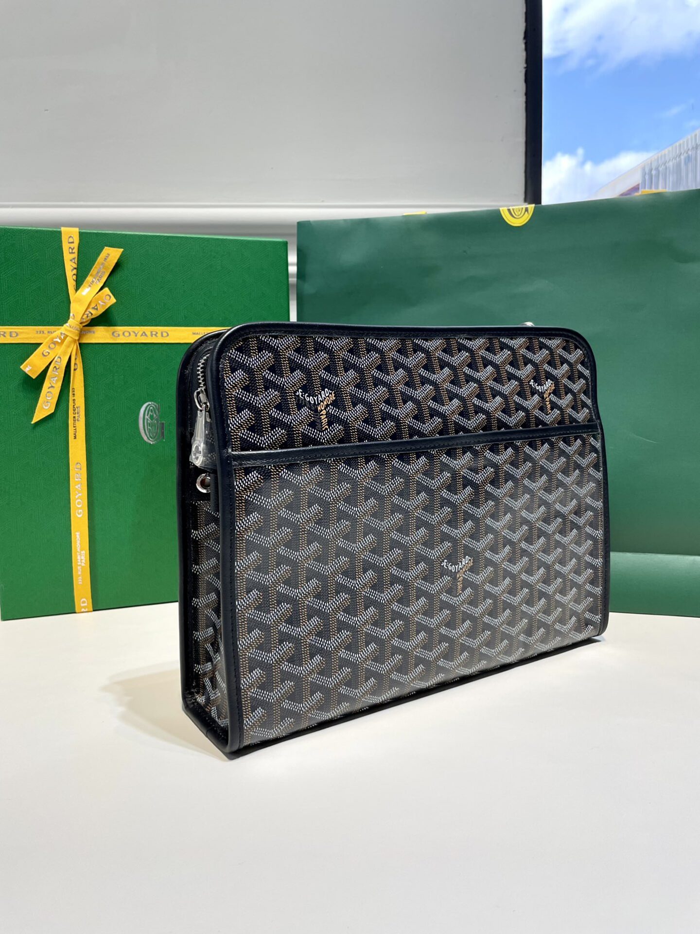 고야드의 주방스 GM 클러치백은 세련된 블랙 컬러로 어떤 스타일에도 잘 어울립니다.