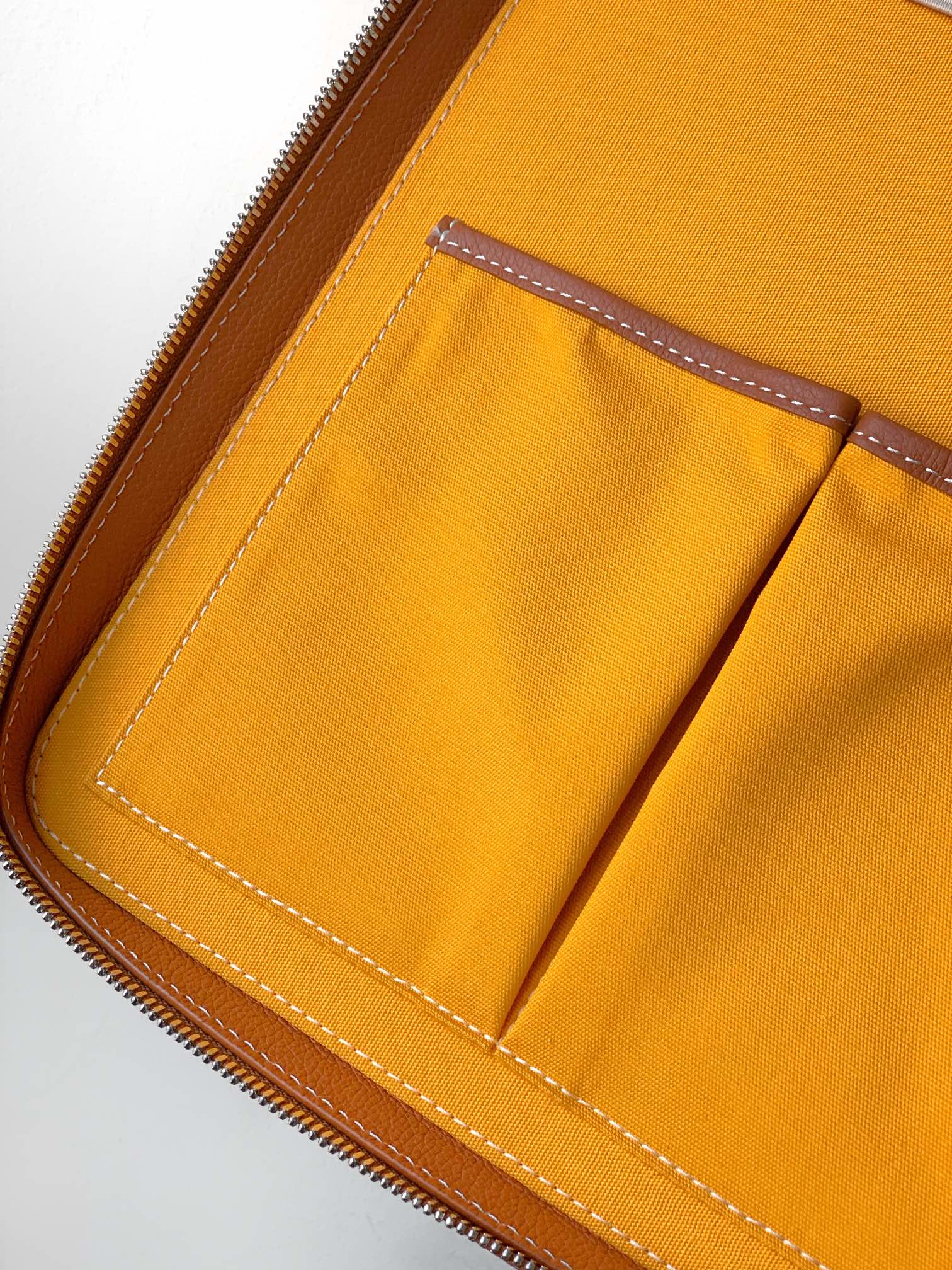 내부에는 13인치 노트북, 노트, 문서, 펜, 카드 지갑, 동전, 안경, 충전기 등을 수납할 수 있는 두 개의 내포켓이 마련되어 있어 매우 실용적입니다.