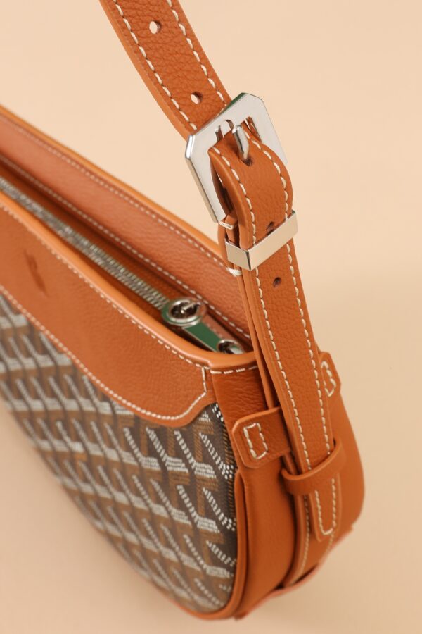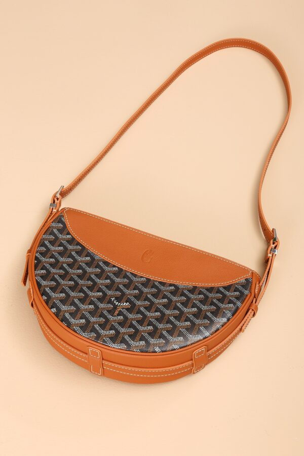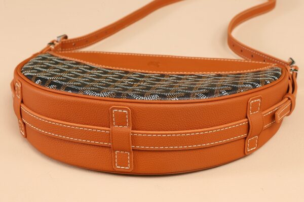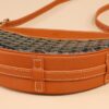 고야드의 히론델 백은 반달 모양으로 독특한 디자인을 자랑합니다. 이 가방은 GOYARDINE 캔버스와 CHEVROCHES 소가죽으로 제작되어 내구성이 뛰어나며, 고급스러운 질감을 느낄 수 있습니다.