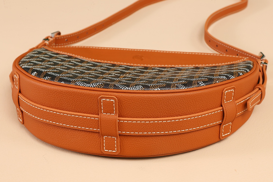고야드의 히론델 백은 반달 모양으로 독특한 디자인을 자랑합니다. 이 가방은 GOYARDINE 캔버스와 CHEVROCHES 소가죽으로 제작되어 내구성이 뛰어나며, 고급스러운 질감을 느낄 수 있습니다.