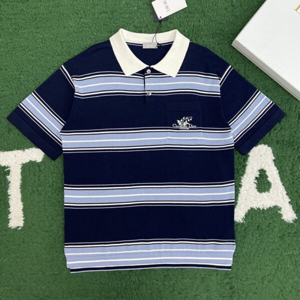 디올의 꾸뛰르 폴로 셔츠입니다. 스트라이프와 은방울꽃 디자인이 적용된 상품입니다.