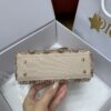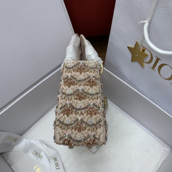 사틴 소재로 정교하게 제작된 레이디 디올 미니백입니다. 화려한 자수와 진주 장식이 어우러져 Dior의 독창적인 장인정신을 느낄 수 있습니다.