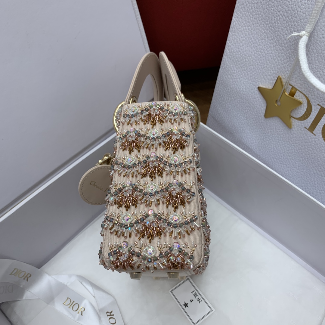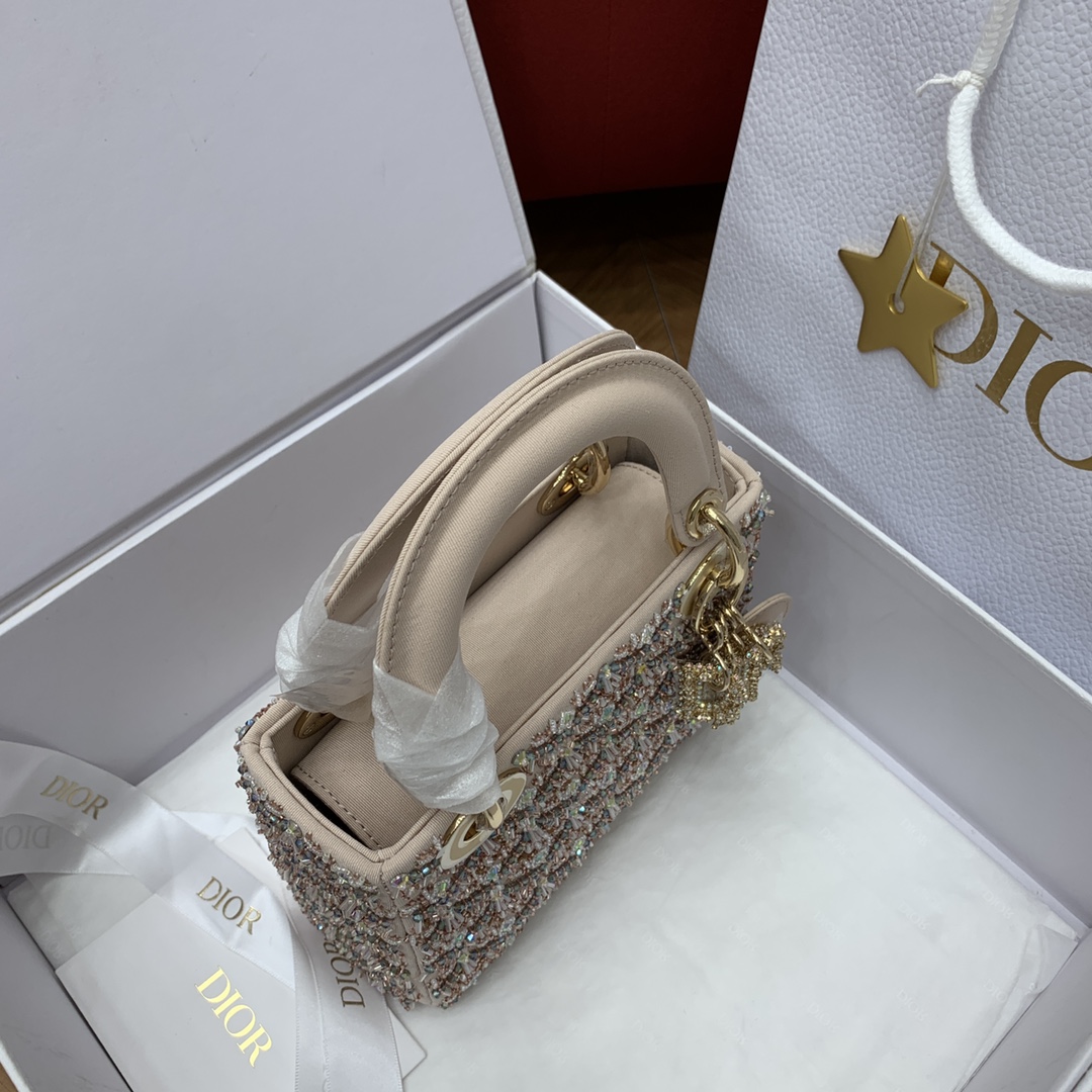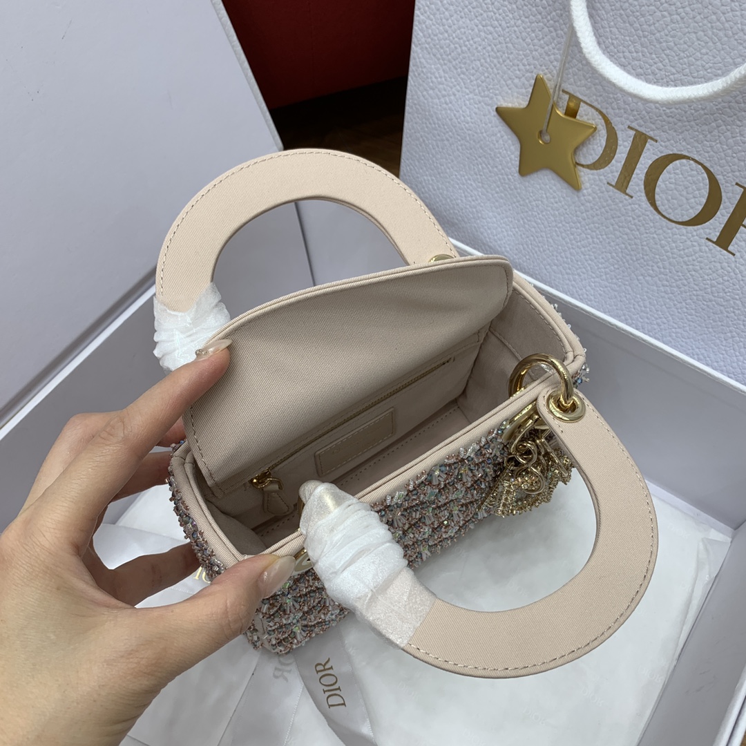 사틴 소재로 정교하게 제작된 레이디 디올 미니백입니다. 화려한 자수와 진주 장식이 어우러져 Dior의 독창적인 장인정신을 느낄 수 있습니다.