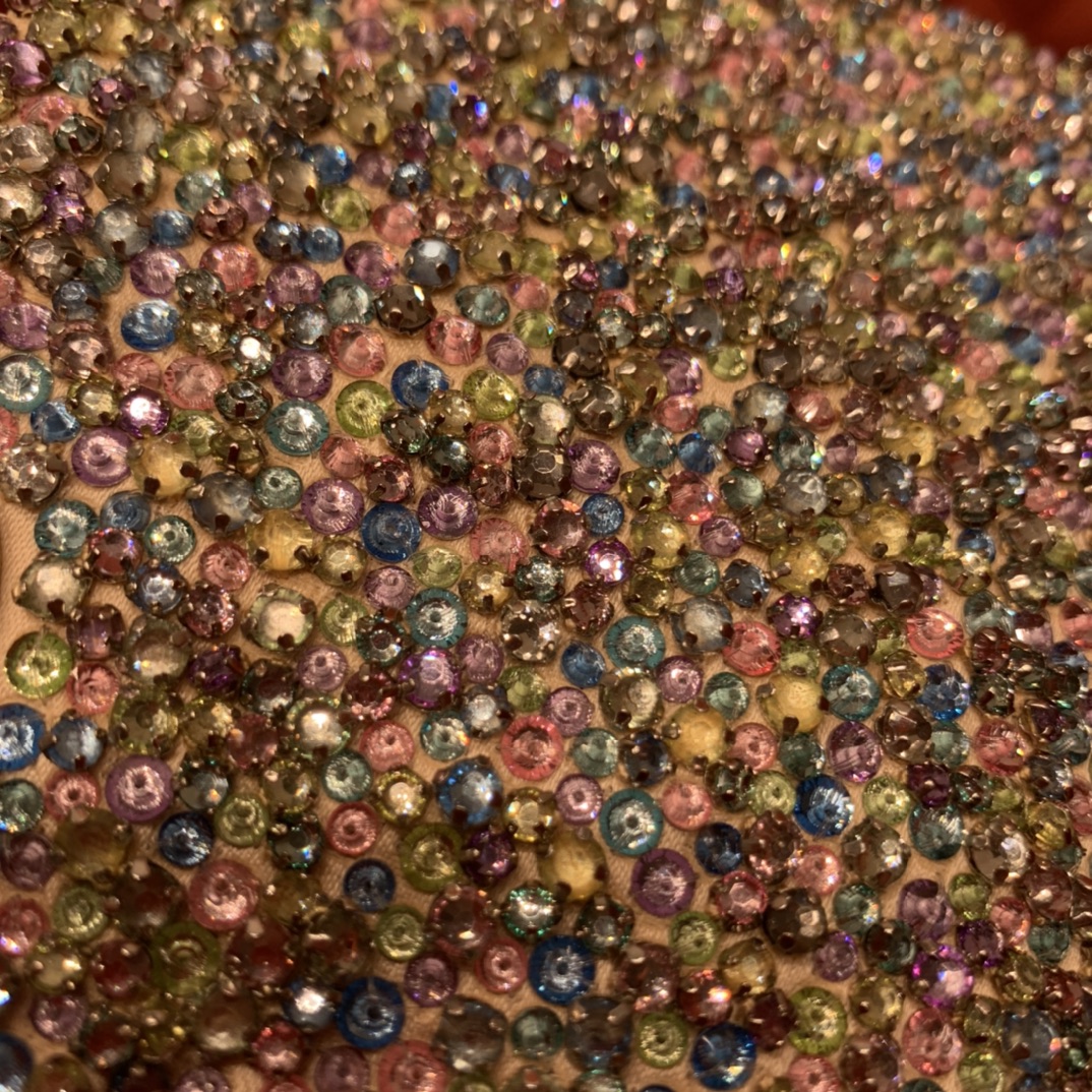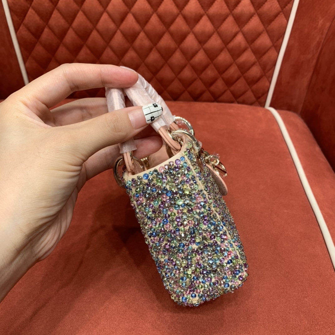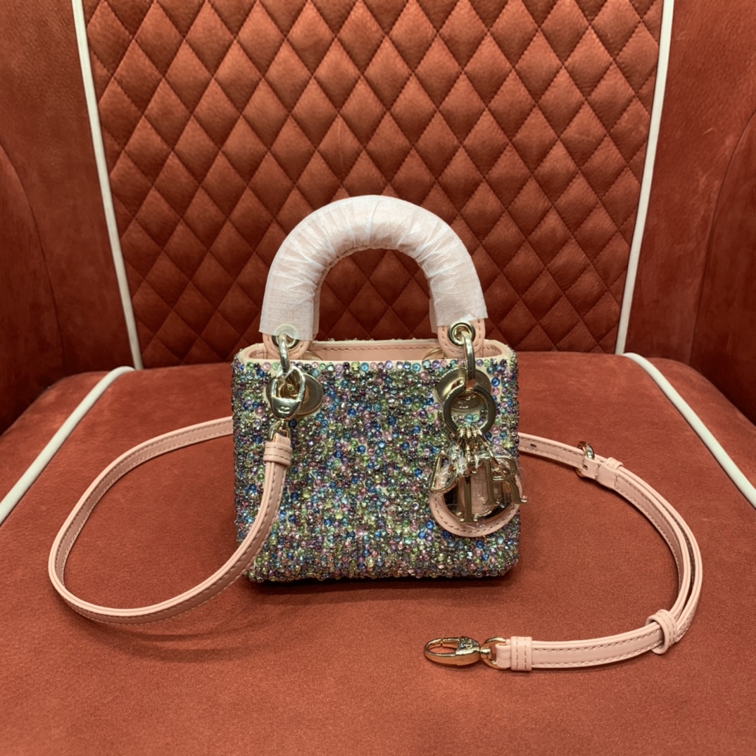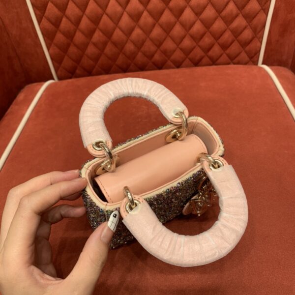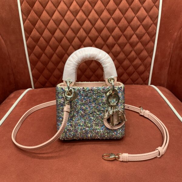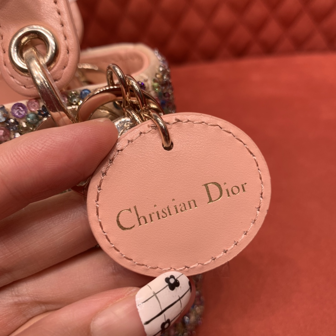 다채로운 진주 장식과 함께 얕은 금색 D.I.O.R. 메탈 장식이 조화를 이루어 세련된 매력을 발산합니다.