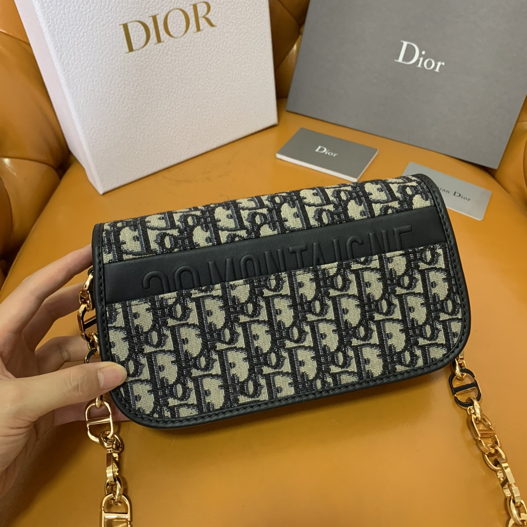 디올의 몽타뉴 30 AVENUE 체인백은 블루 오블리크 프린트 면 소재로 제작되어 세련된 매력을 더합니다.