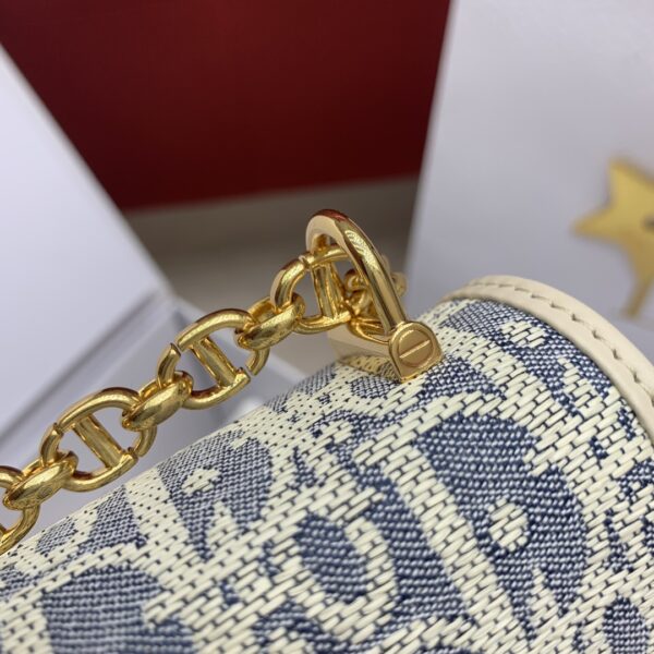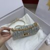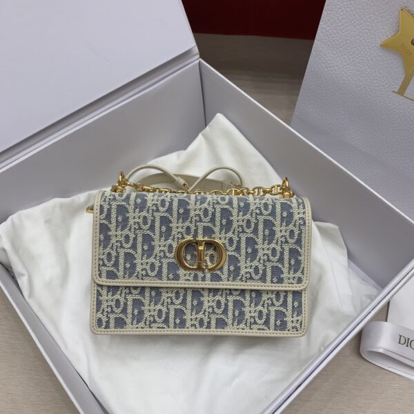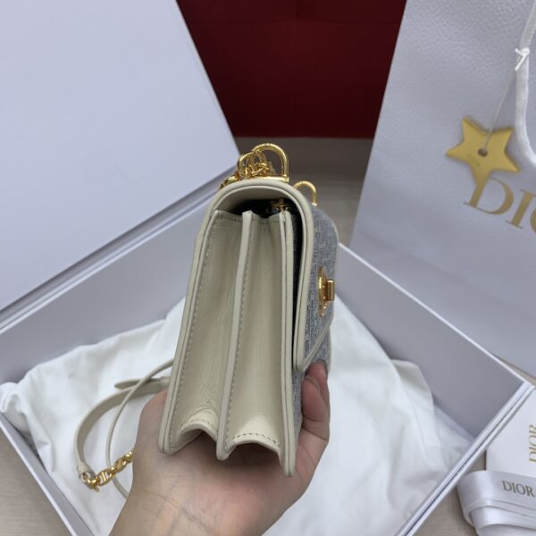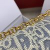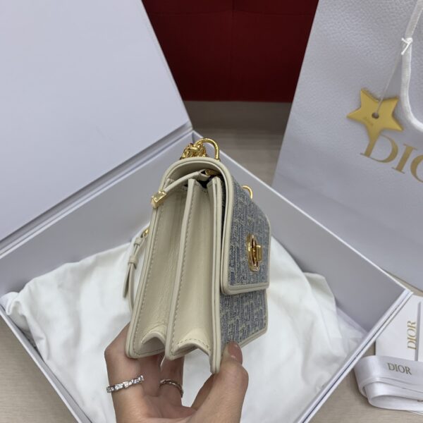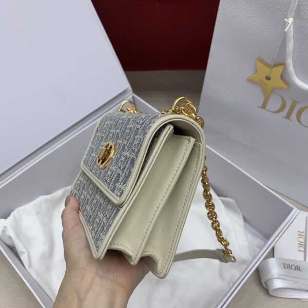 디올의 미스 카로 미니 체인백은 세련된 디자인으로, 아이보리색의 부드러운 소가죽과 블루 체크 패브릭이 조화를 이루어 우아한 매력을 발산합니다.