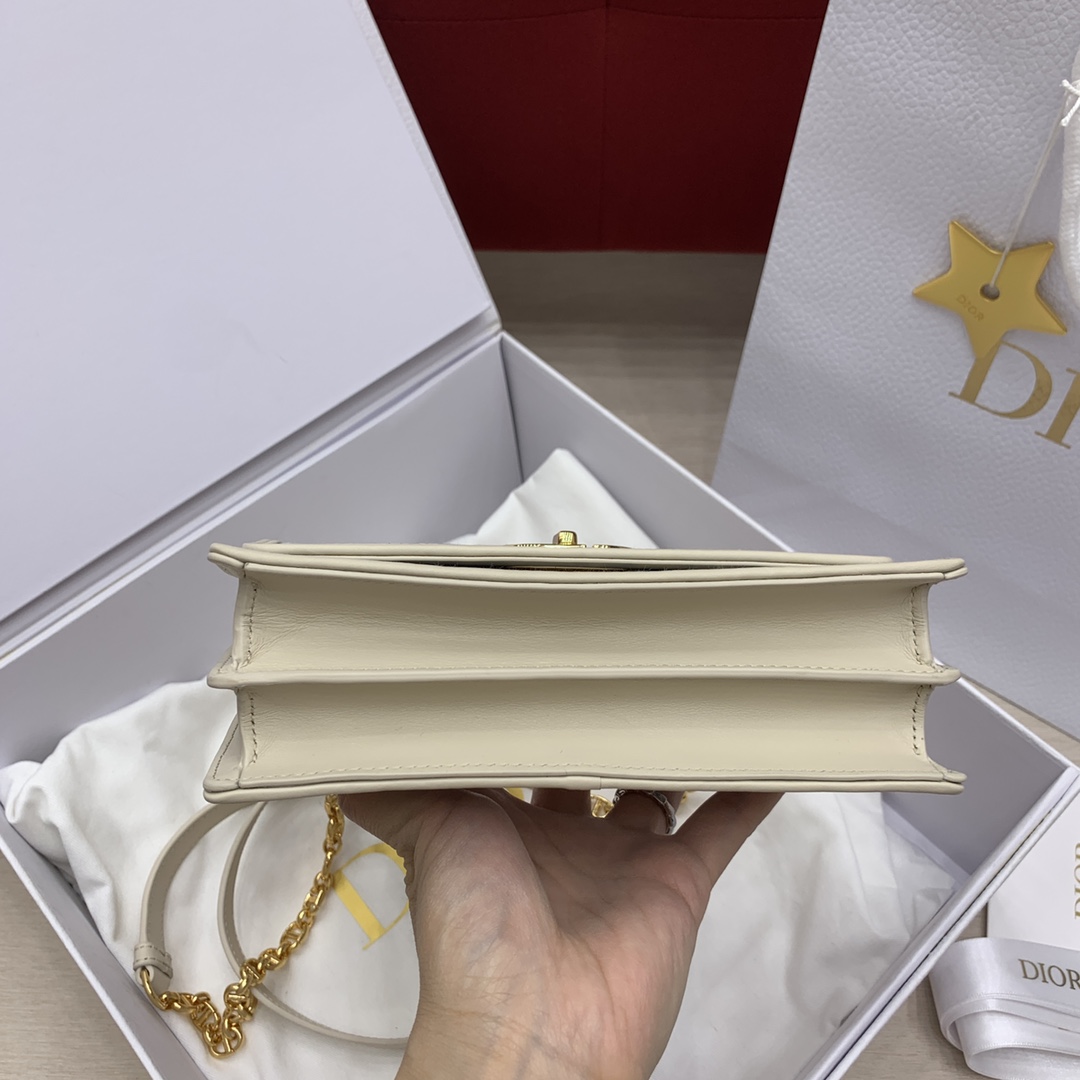 디올의 미스 카로 미니 체인백은 세련된 디자인으로, 아이보리색의 부드러운 소가죽과 블루 체크 패브릭이 조화를 이루어 우아한 매력을 발산합니다.
