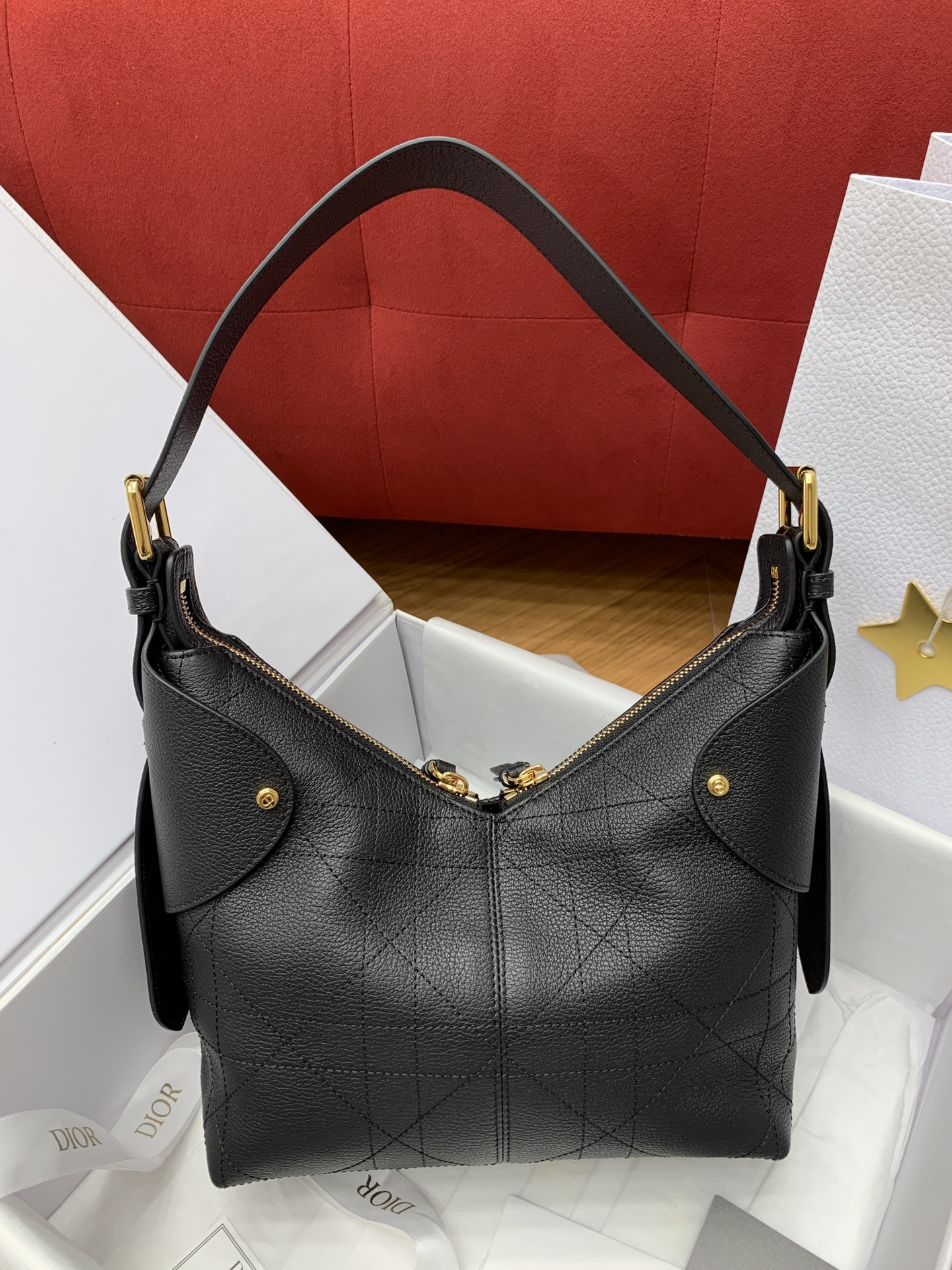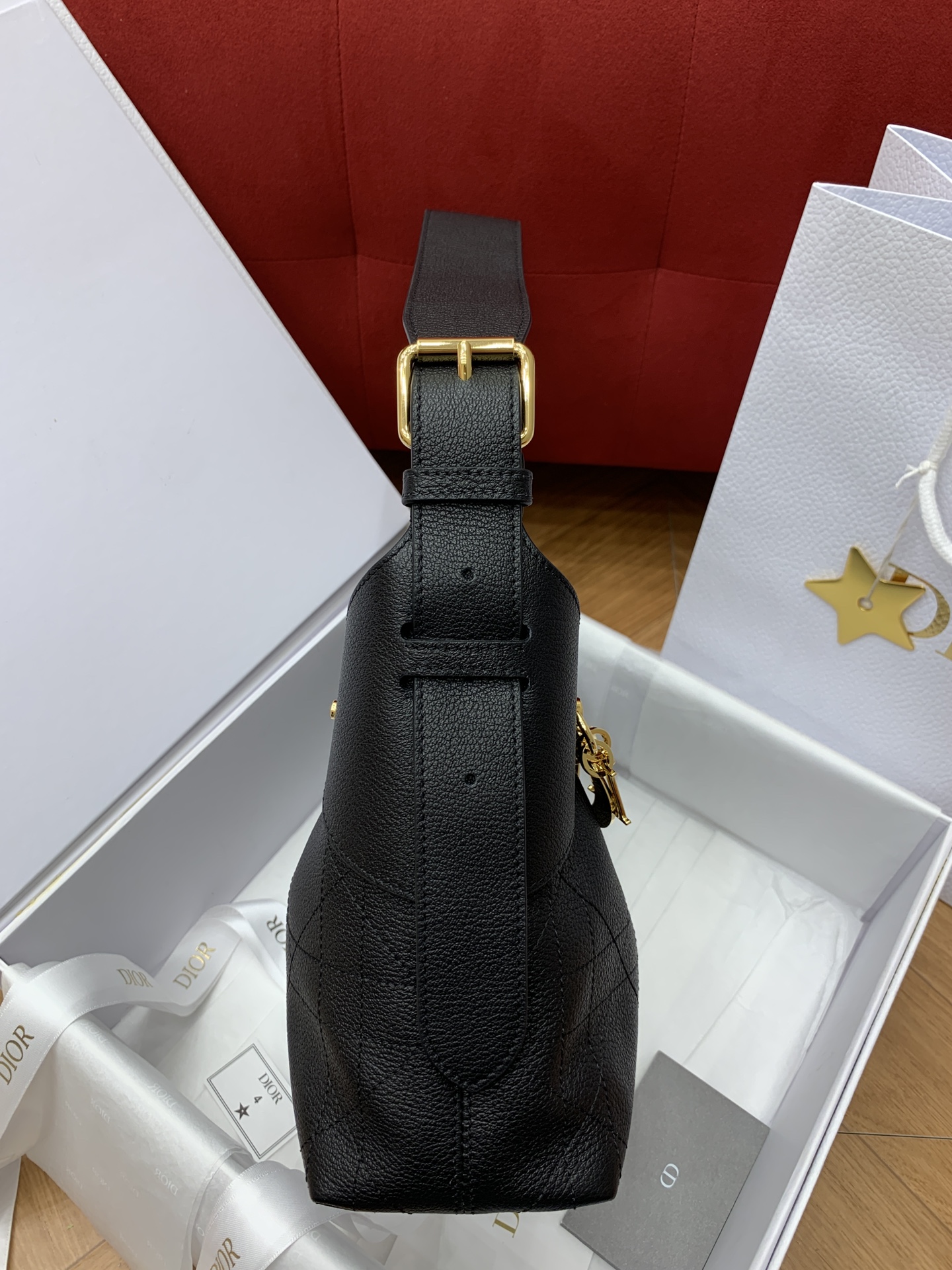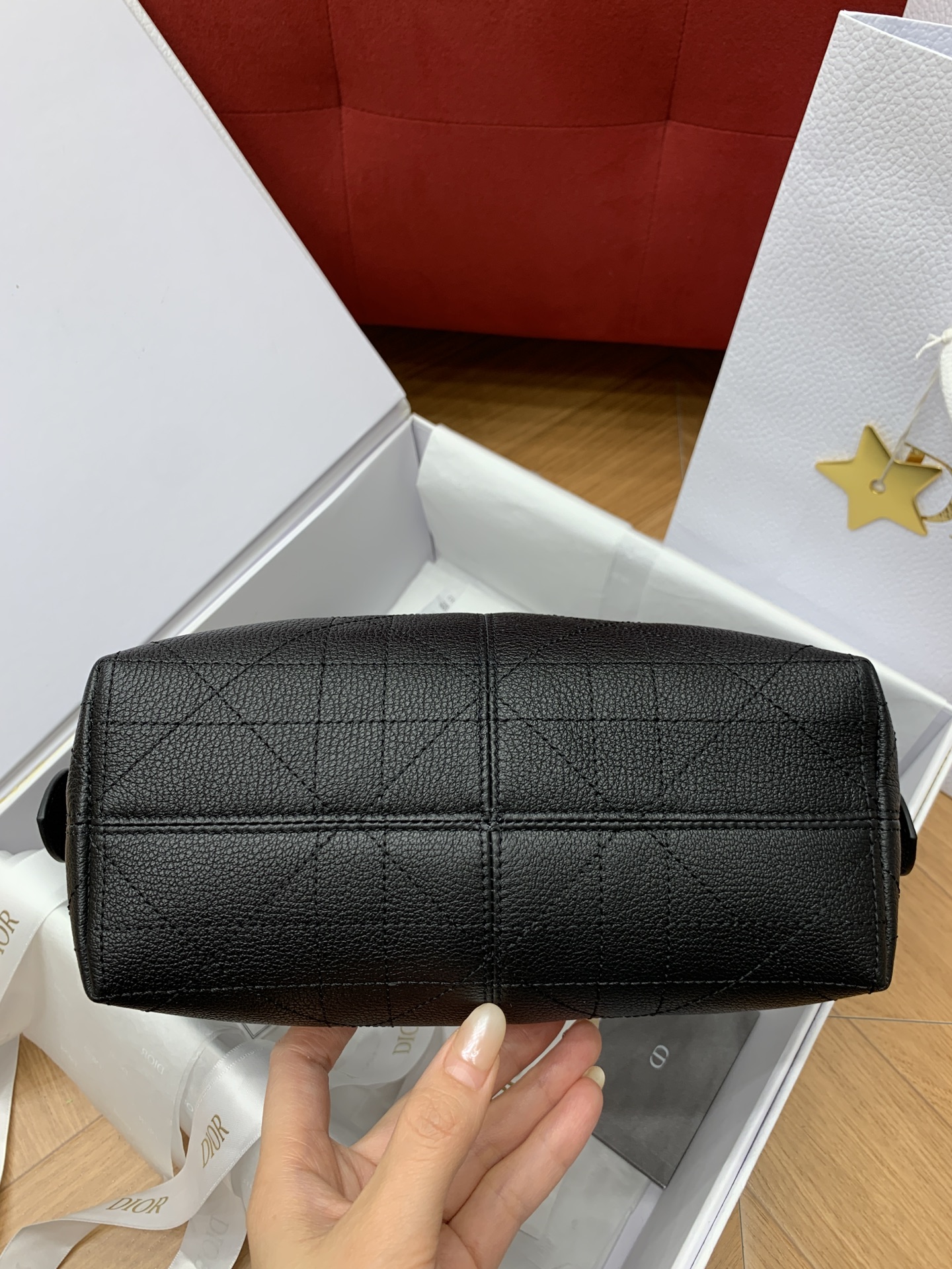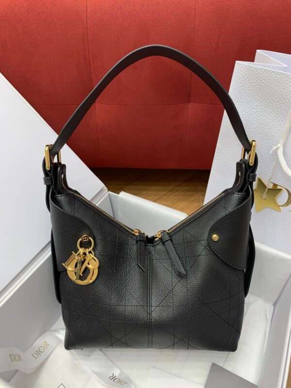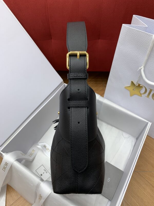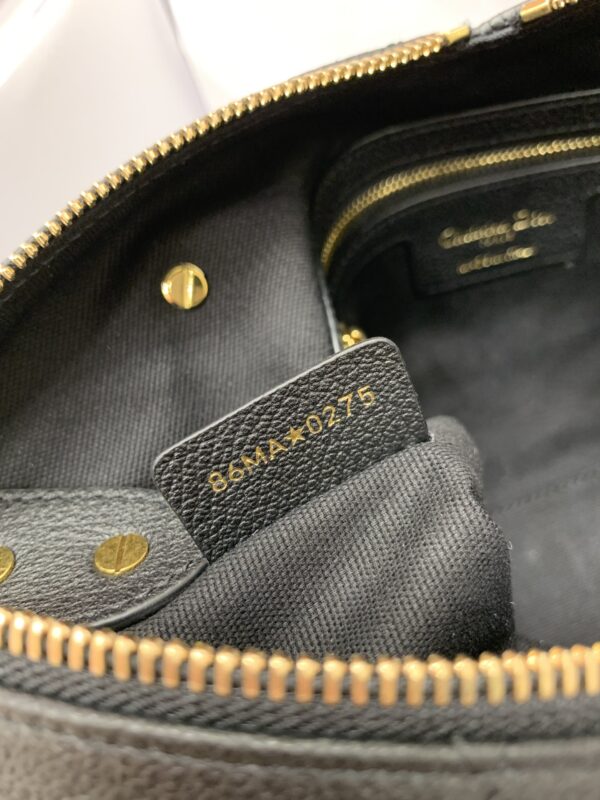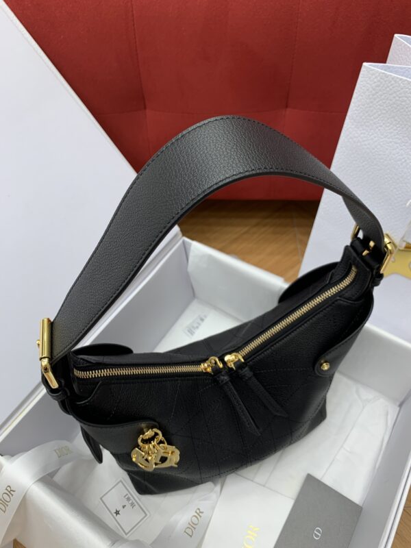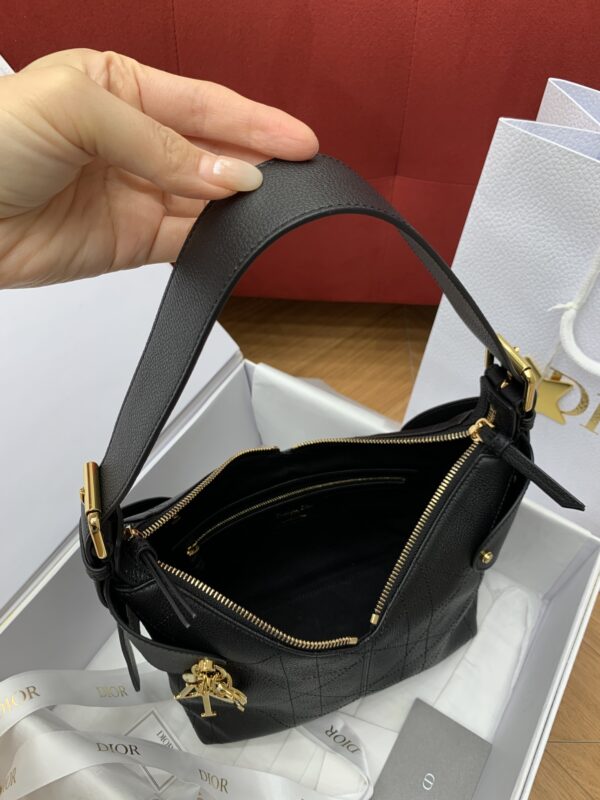 디올의 보야주 미니 백은 블랙 캐비어 가죽으로 제작되어 고급스러운 질감을 자랑합니다.