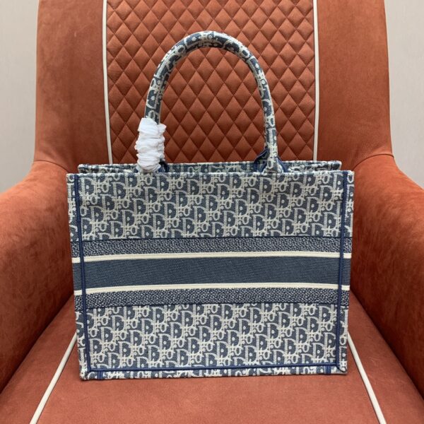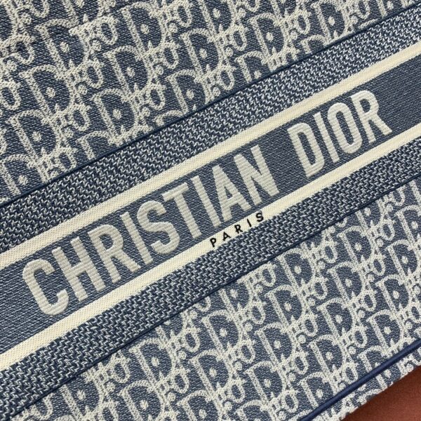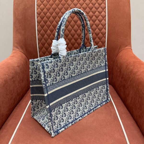 디올의 북 토트백은 고급스러운 자수 캔버스 소재로 제작되어 세련된 느낌을 줍니다.
