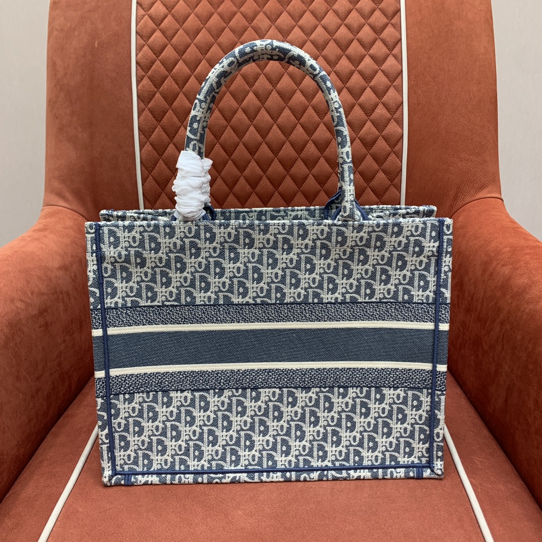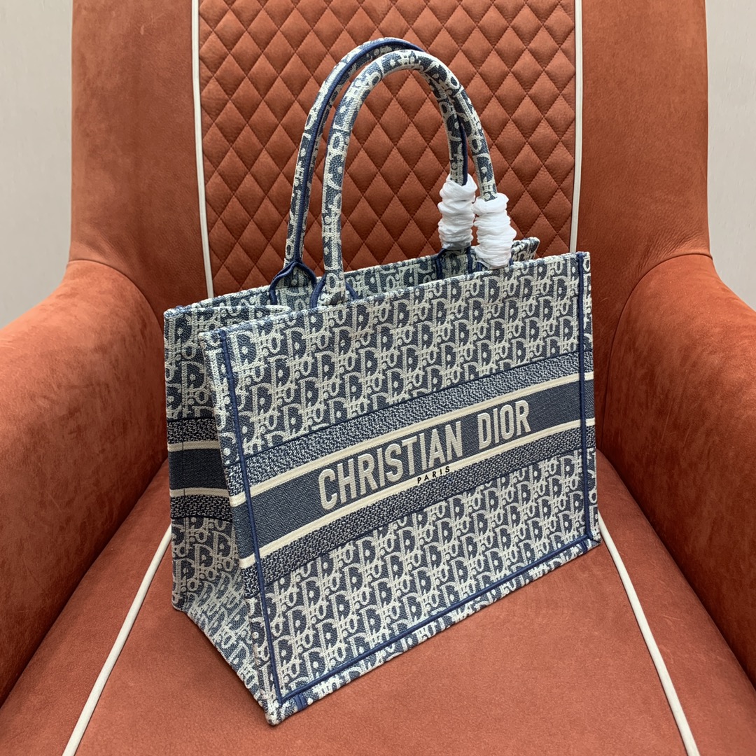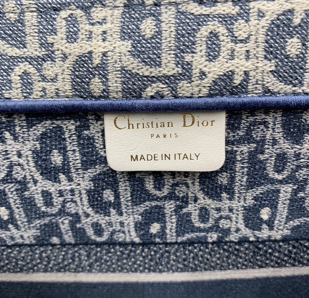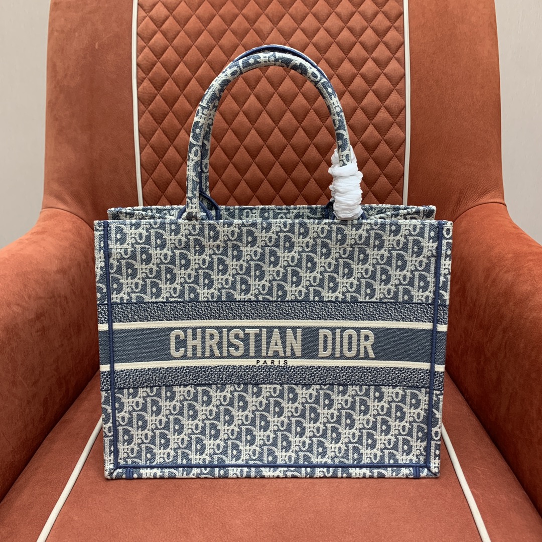 디올의 북 토트백은 고급스러운 자수 캔버스 소재로 제작되어 세련된 느낌을 줍니다.