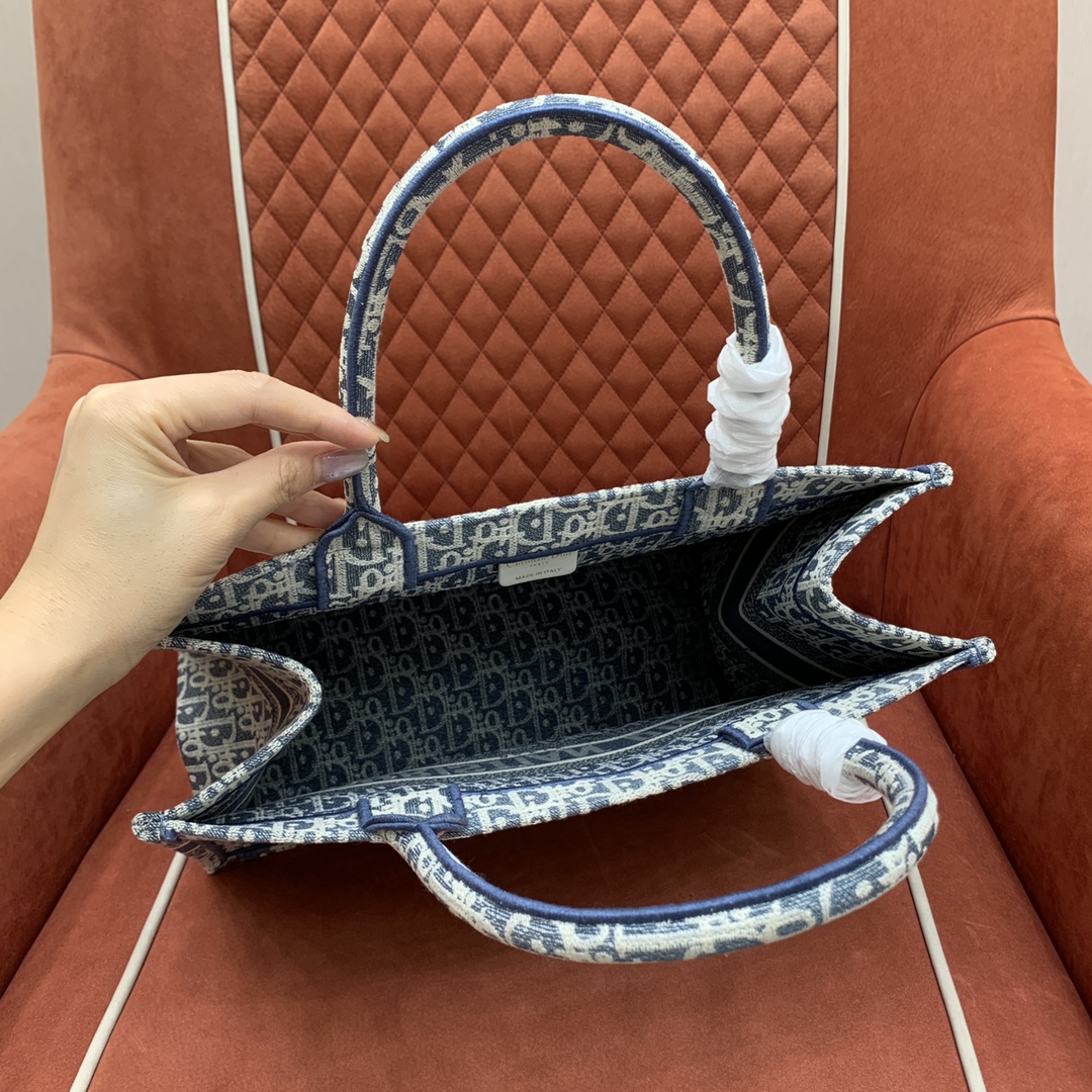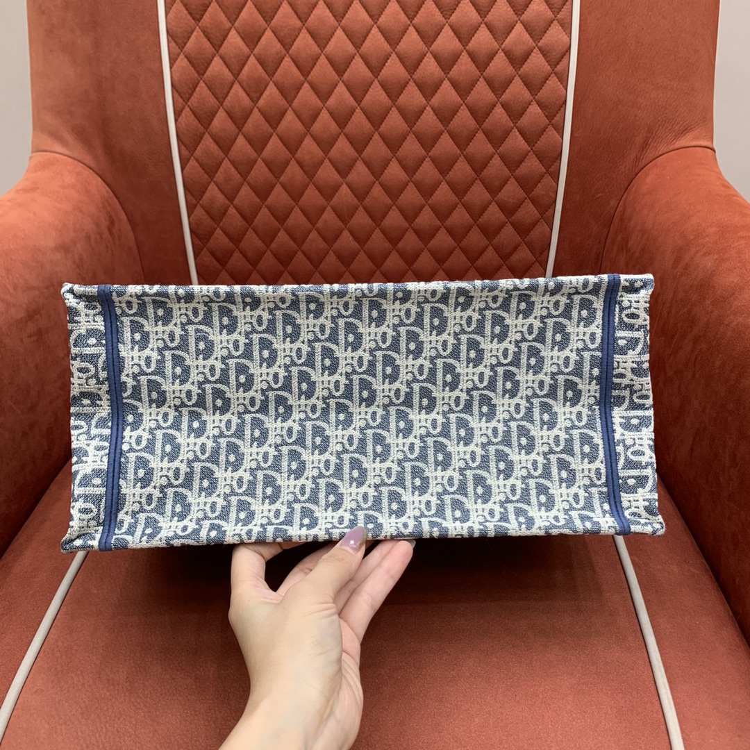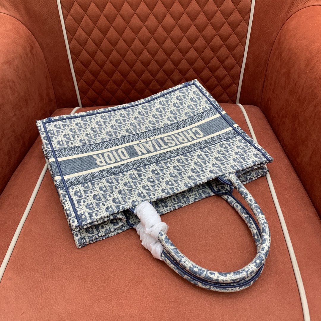 디올의 북 토트백은 고급스러운 자수 캔버스 소재로 제작되어 세련된 느낌을 줍니다.