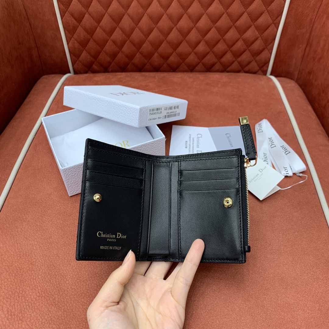 지갑의 전면에는 디올의 상징적인 CD 로고가 세련되게 장식되어 있어, 브랜드의 아이코닉한 매력을 한층 강조합니다.