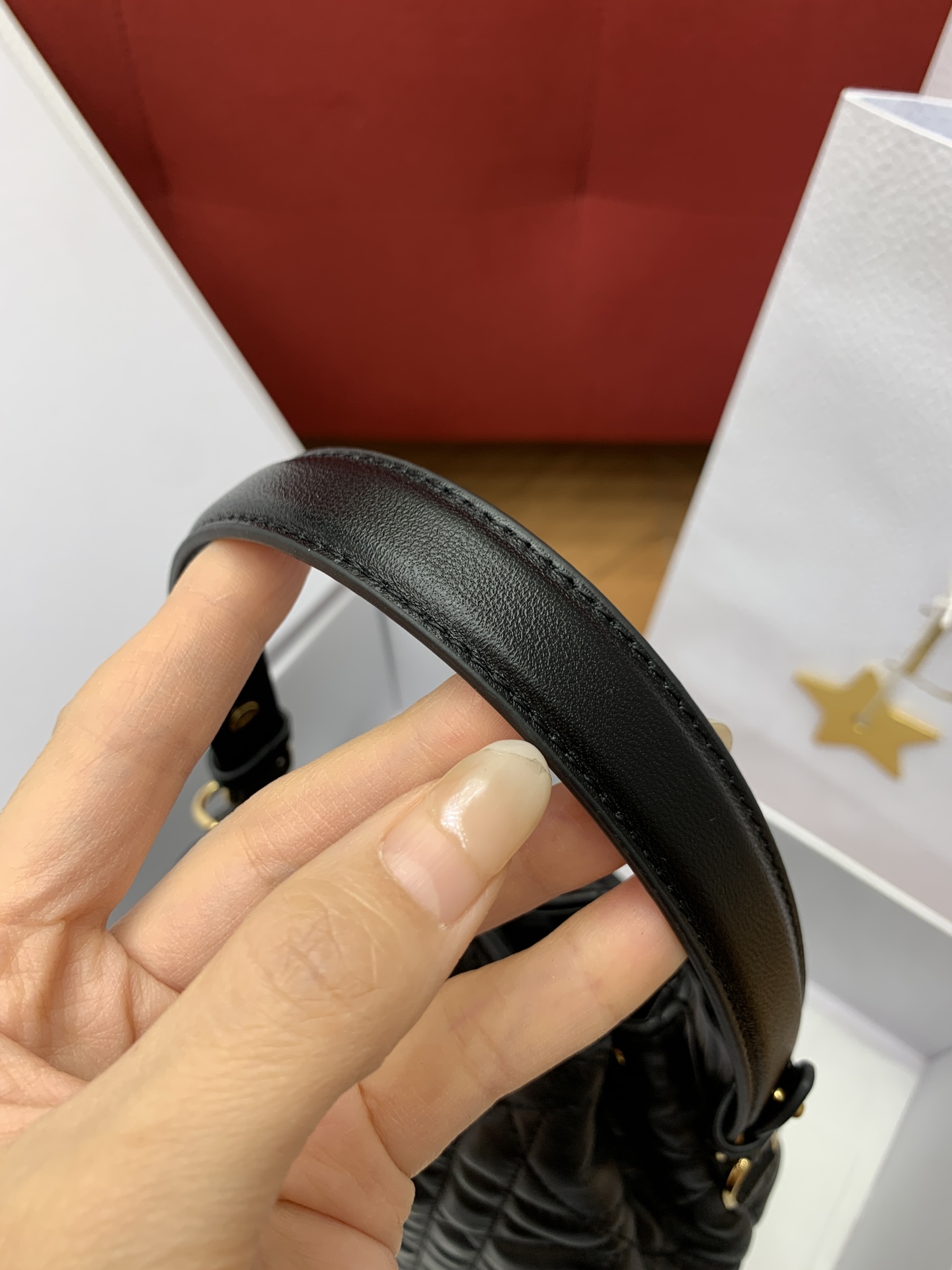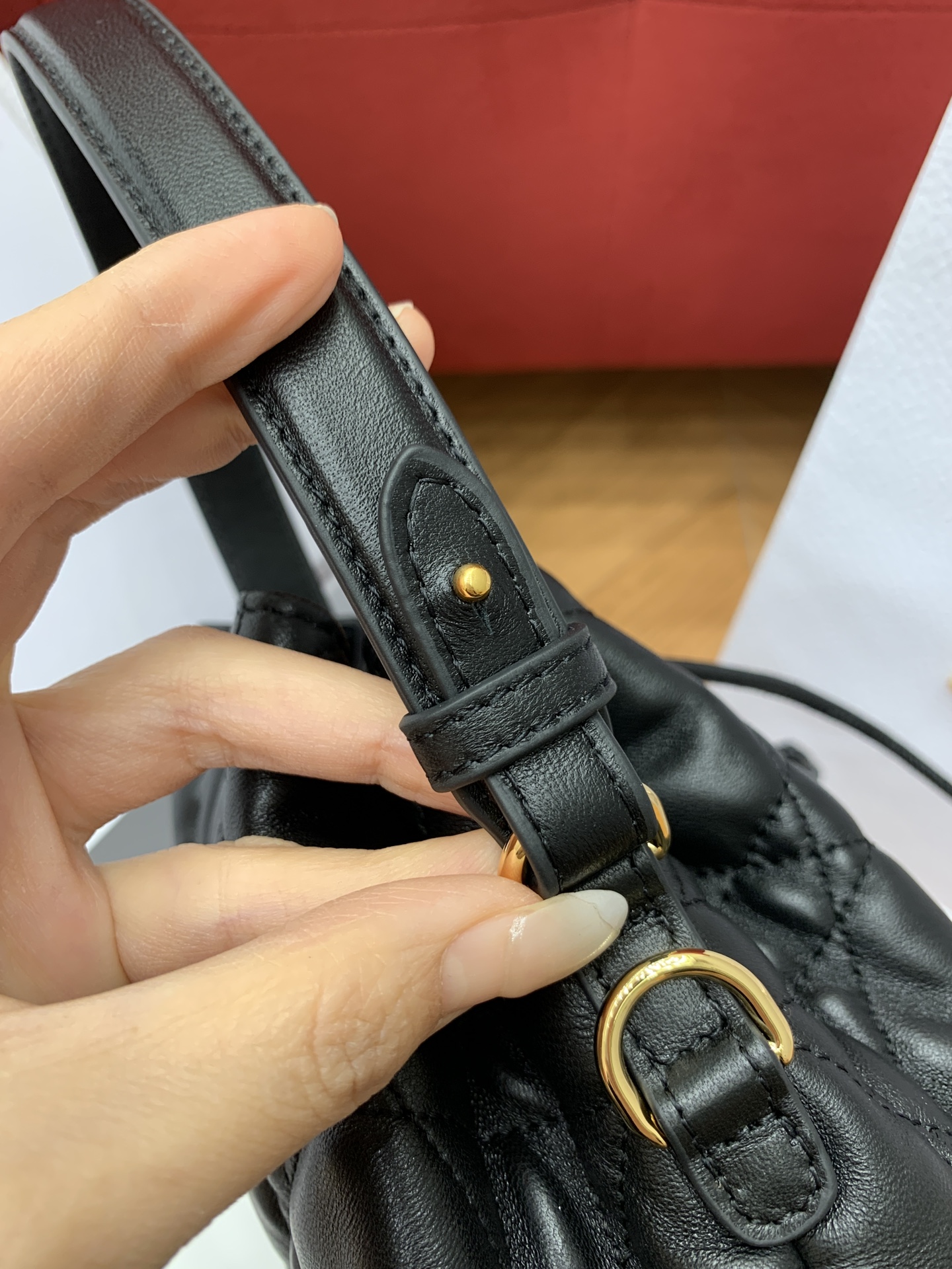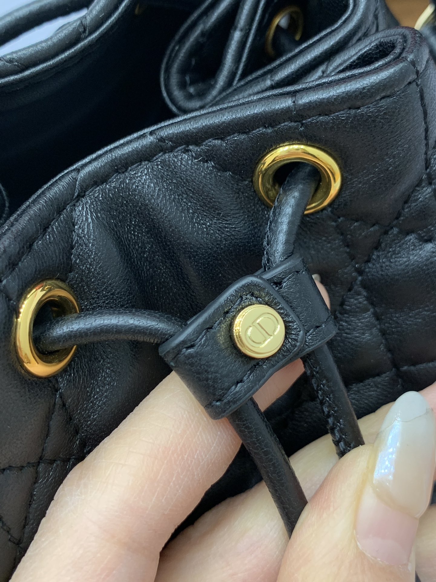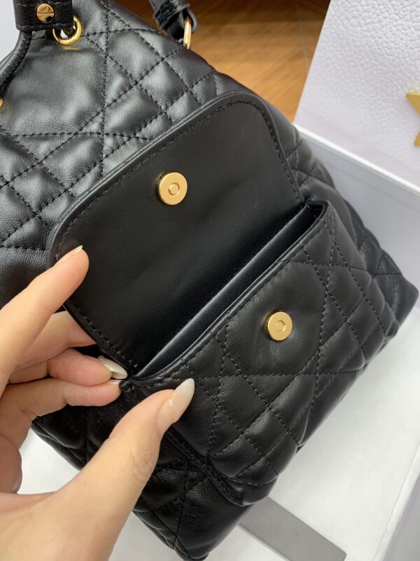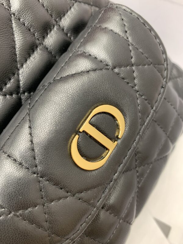 디올의 카로 블랙 버킷백은 고급스러운 퀼팅 디자인이 돋보이는 아이템입니다.