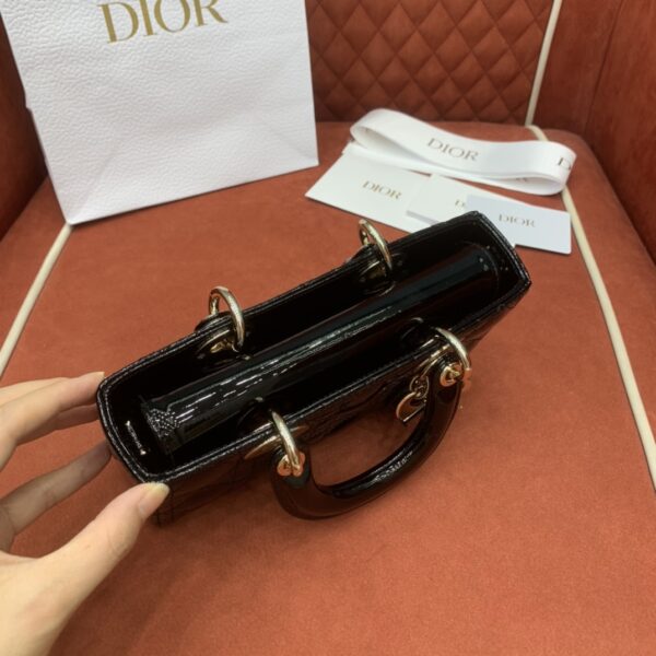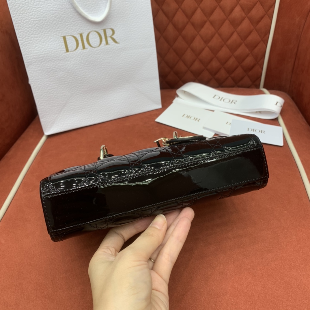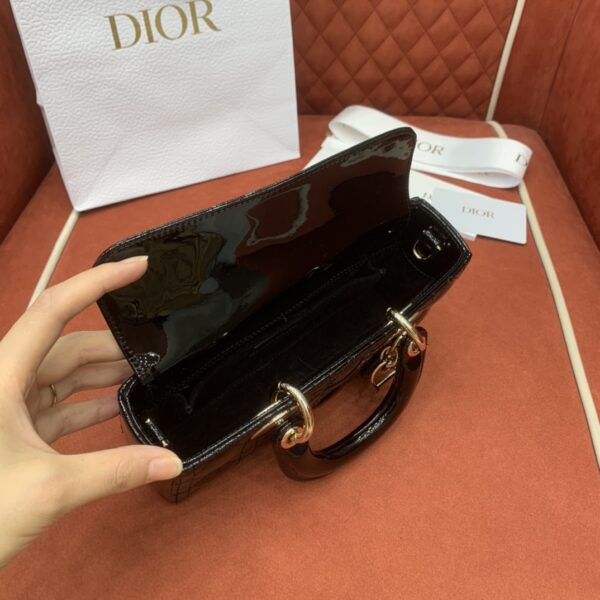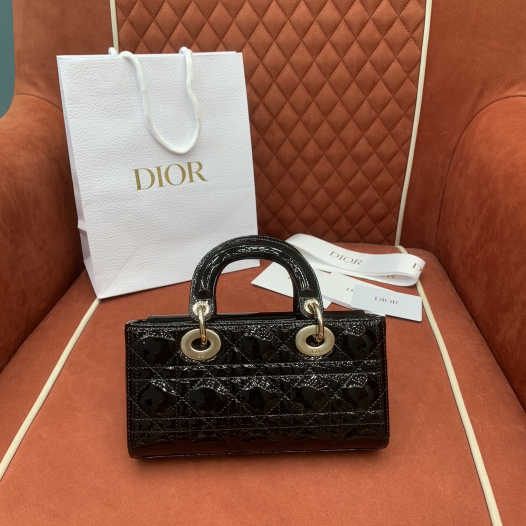 디올의 D-joy 미니백은 세련된 블랙 에나멜 소재로 제작되어 우아함과 현대적인 감각을 동시에 제공합니다.