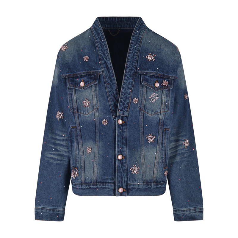 A: 데님 소재 특성상 드라이클리닝을 권장하며, 라인스톤과 자수 부분은 세심하게 다뤄야 합니다.