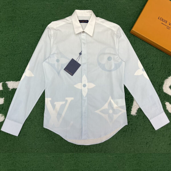 - 루이비통 브랜드의 모노그램 프린티드 셔츠로 남녀 모두 착용 가능한 의류 상의입니다.
