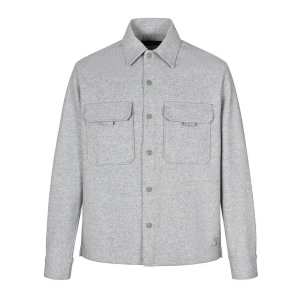 - 루이비통 브랜드의 울 소재 오버셔츠로, 플랩 포켓과 모노그램 플라워 패턴이 디자인된 상의입니다.