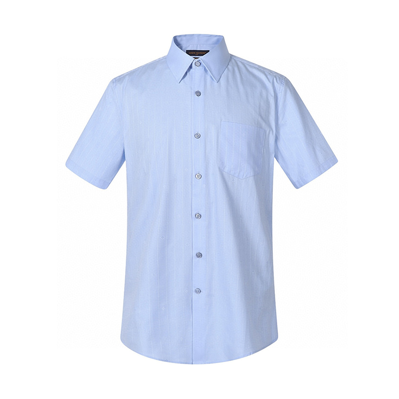 - 루이비통 브랜드의 반팔 클래식 셔츠로, 모노그램과 핀 스트라이프 패턴이 조화를 이루고 있습니다.