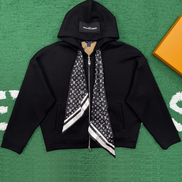 - 루이비통 브랜드의 후드 집업 스카프로, 모노그램 디자인이 적용된 제품입니다.