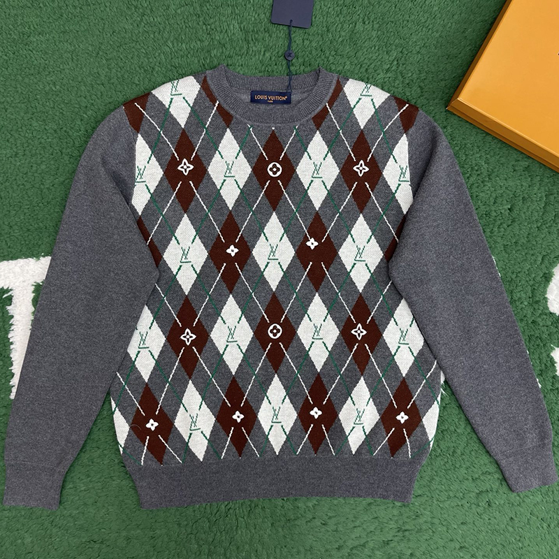 - 루이비통 모노그램 디자인이 적용된 크루넥 니트로, 우아한 아가일 패턴이 특징입니다.