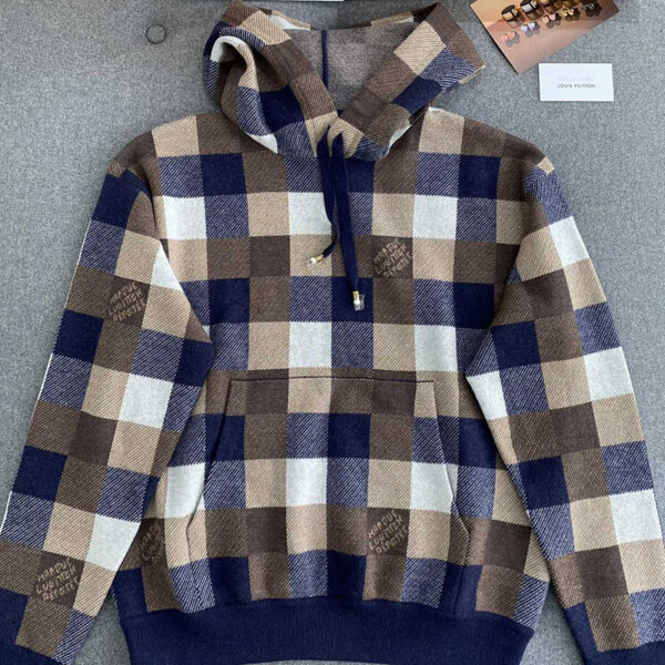 - 루이비통 다미에 패턴이 적용된 후디로, 캐시미어와 울 블렌드 소재를 사용해 편안하게 착용할 수 있습니다.