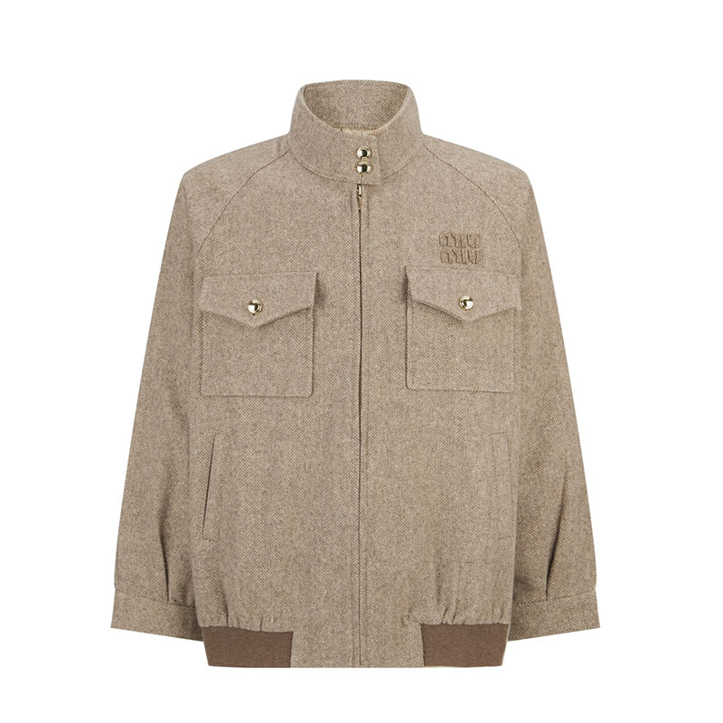 - 미우미우 브랜드의 헤링본 아우터로 로고 아플리케 장식이 있습니다.