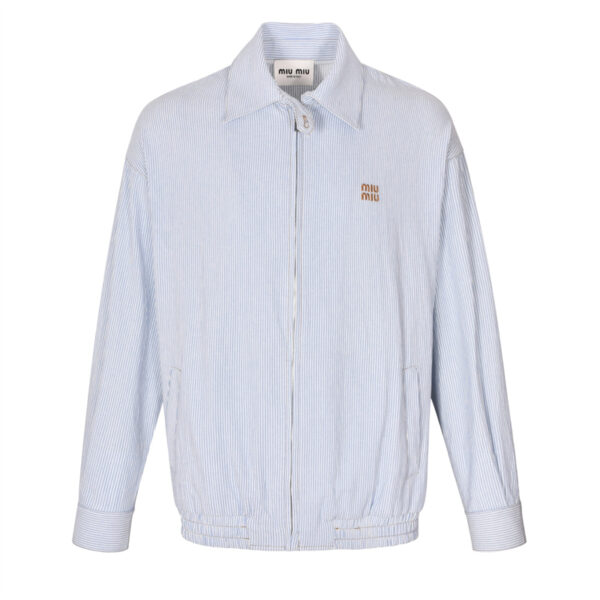 - 미우미우의 스트라이프 디자인과 로고가 특징인 집업 셔츠 자켓입니다.