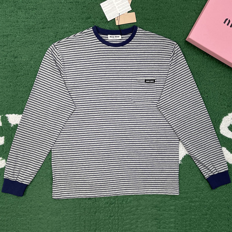 미우미우의 스트라이프 긴팔 저지 티셔츠입니다. 편안한 착용감과 일상복으로 적합한 디자인을 갖췄습니다.