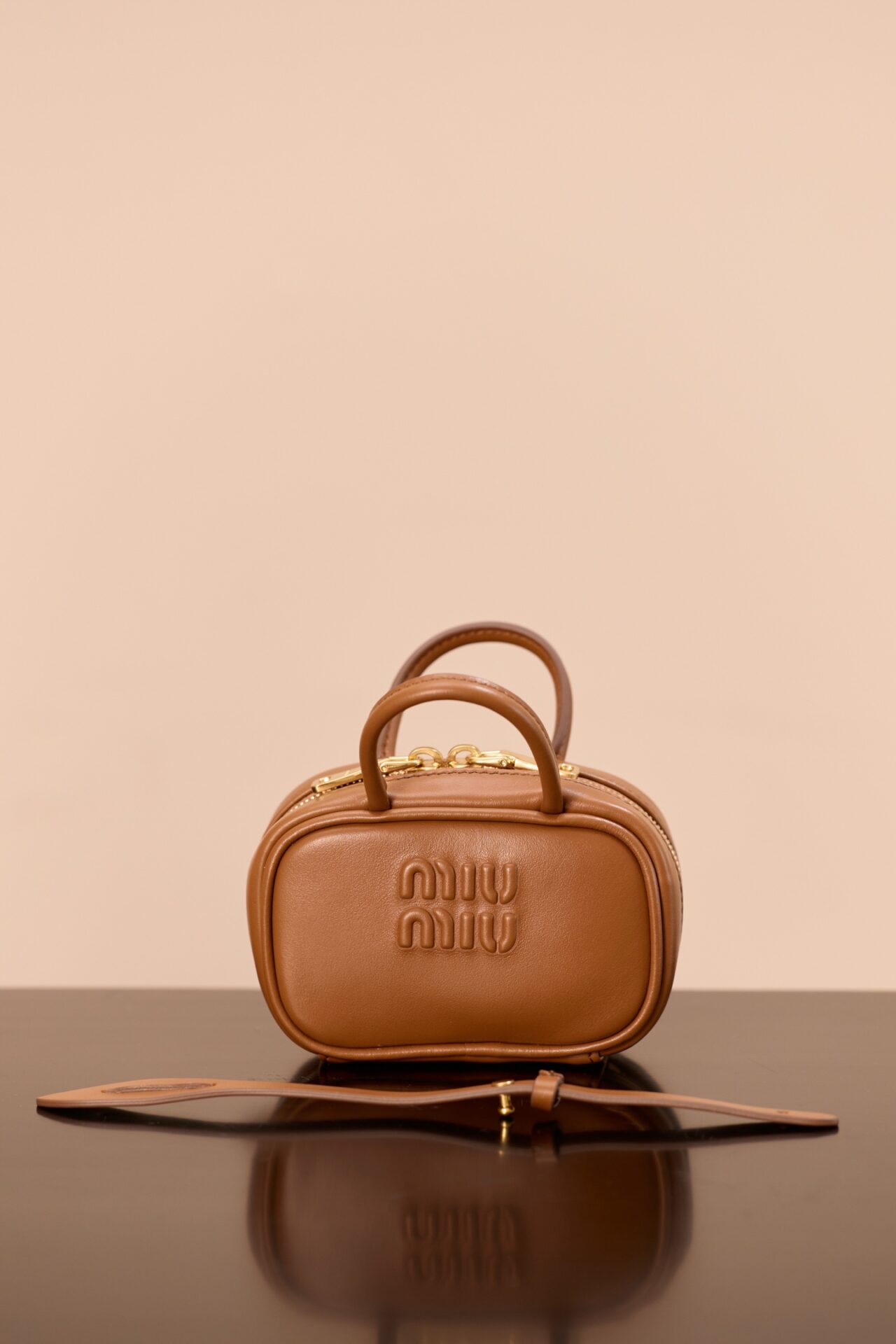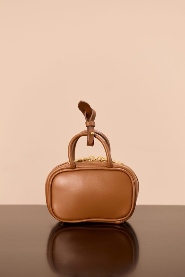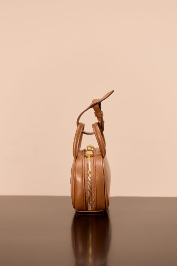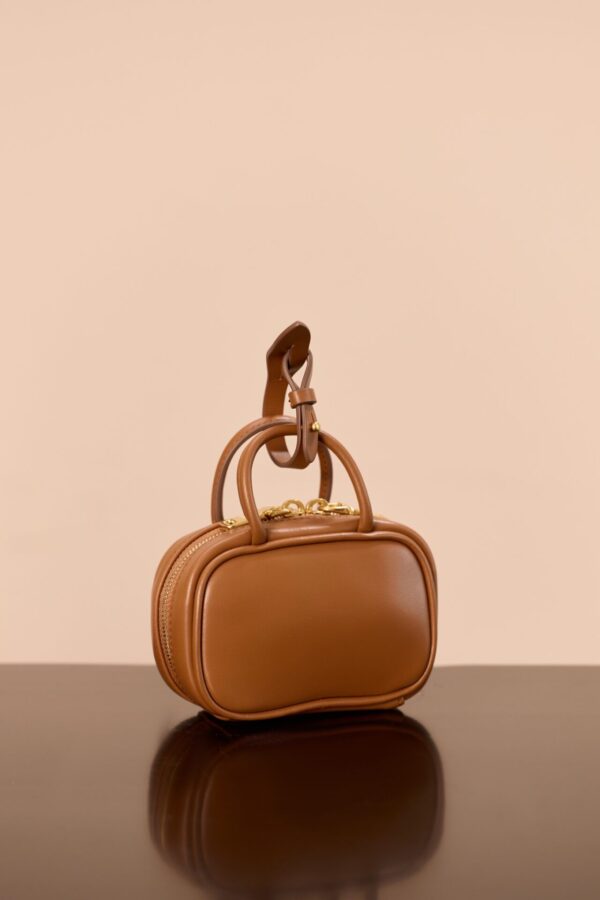 고급 소가죽으로 제작된 미니 백입니다. 건너색의 세련된 컬러가 돋보이며, 브랜드의 아이코닉한 압화 로고가 매력적인 포인트를 더합니다.