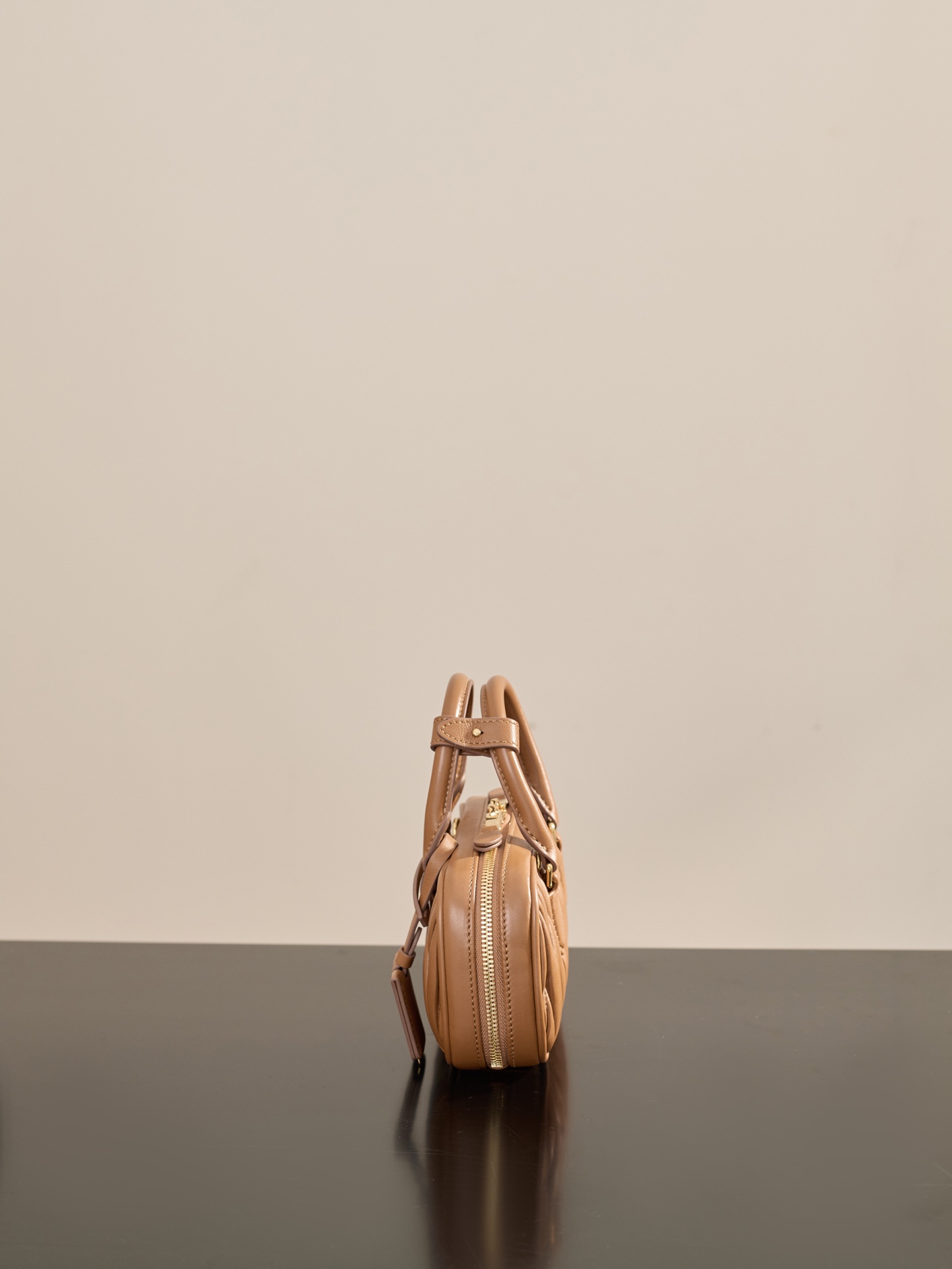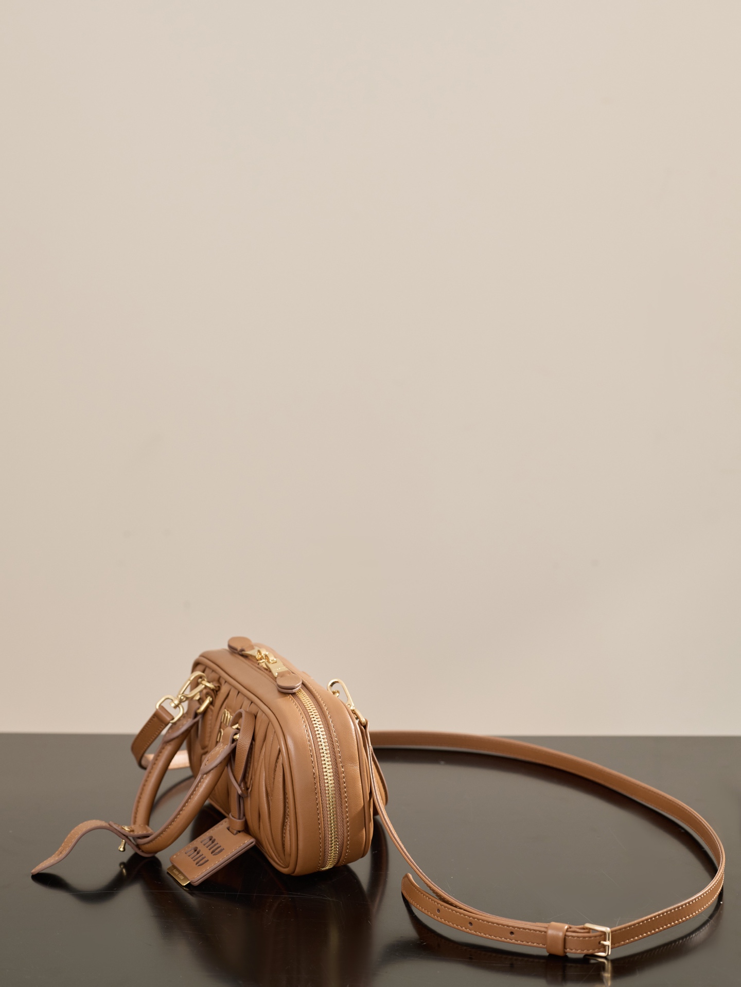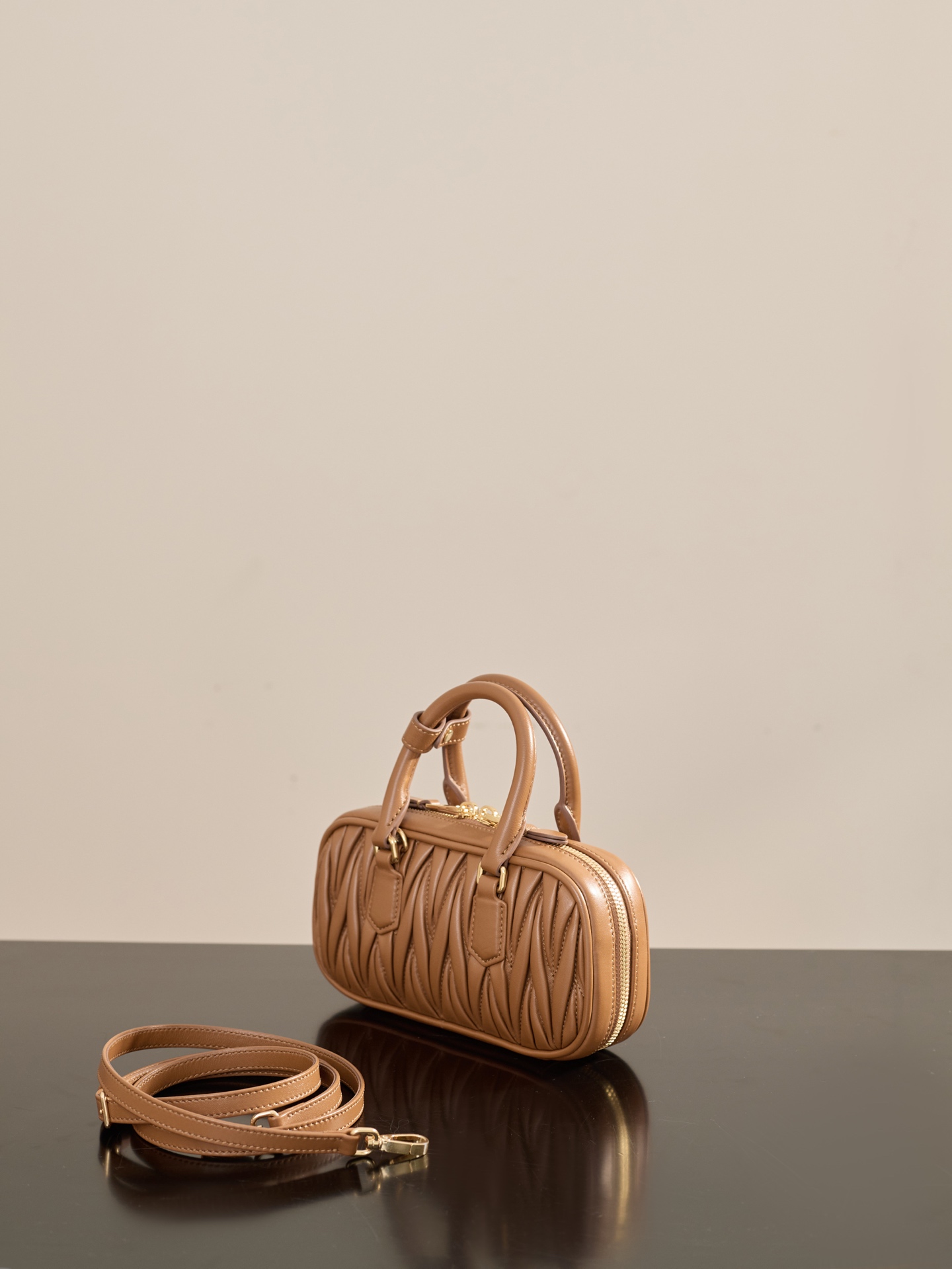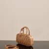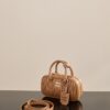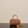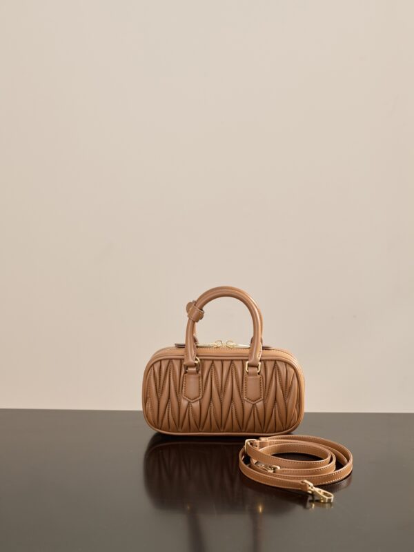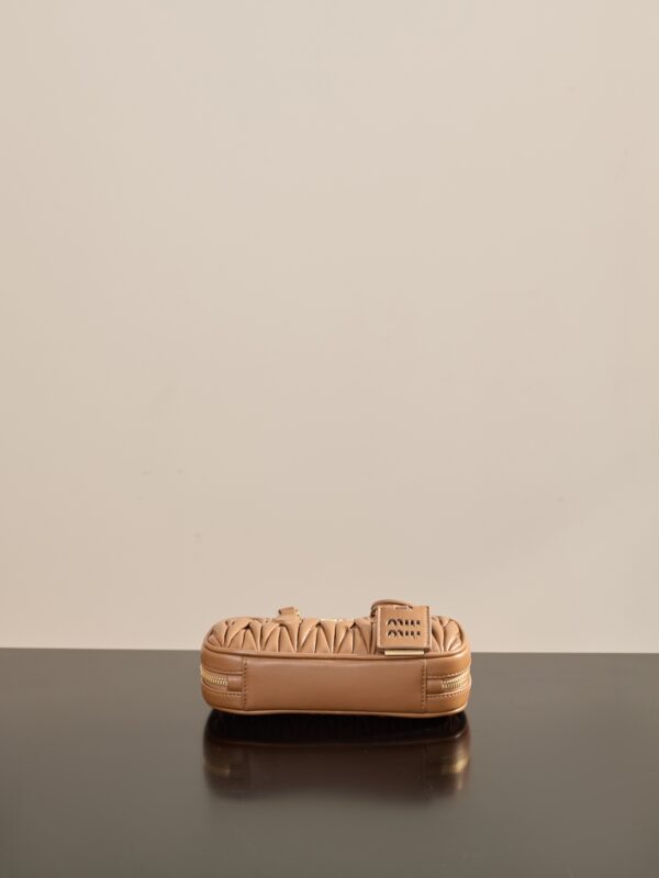 부드러운 양가죽 소재로 제작된 미니 백입니다. 고급스러운 카라멜 색상과 입체적인 주름 디테일이 매력적입니다.