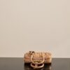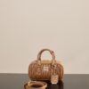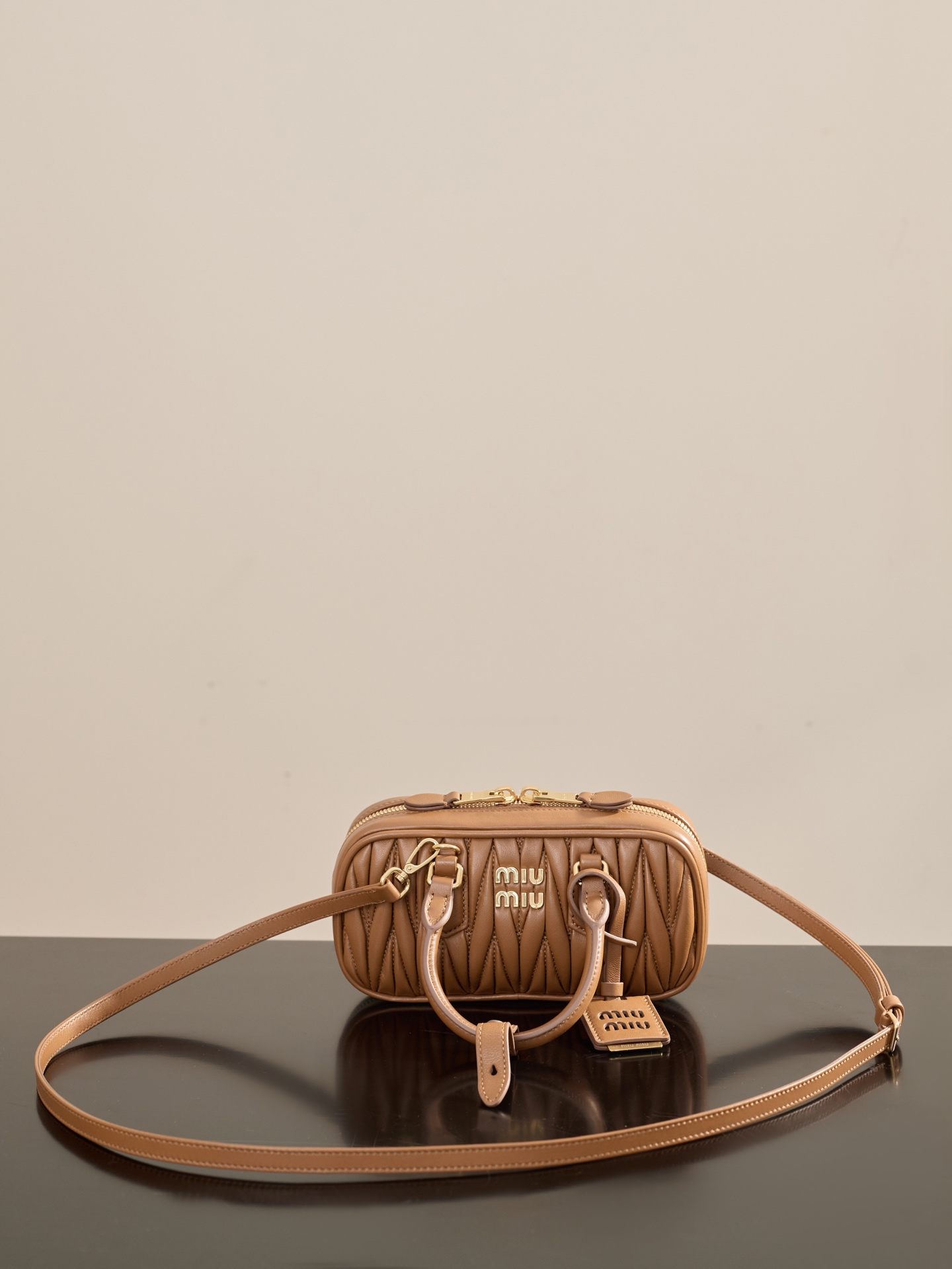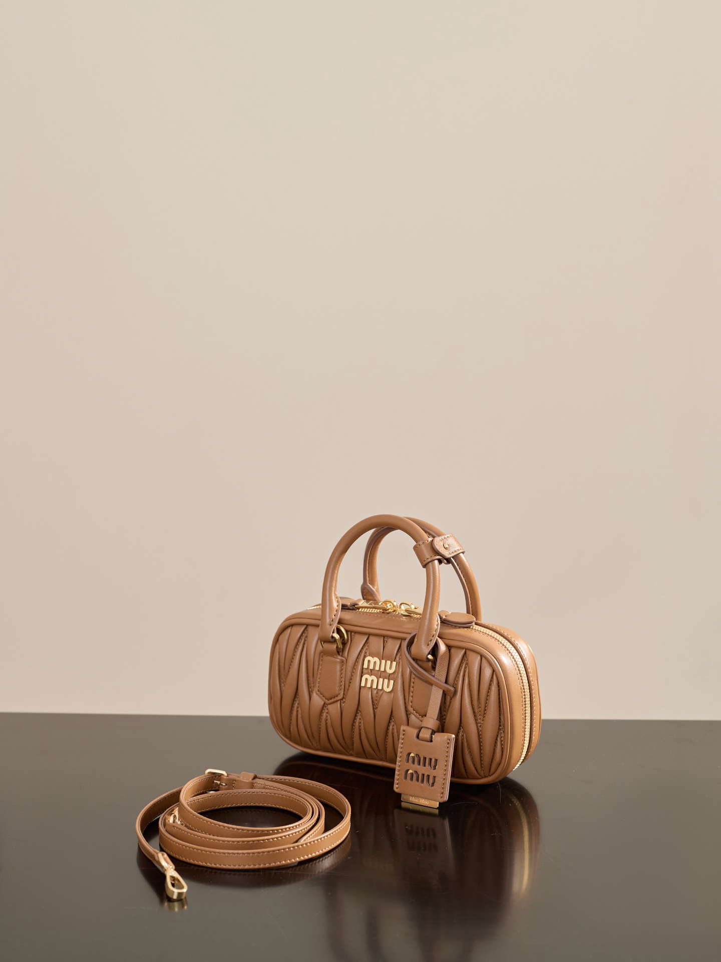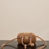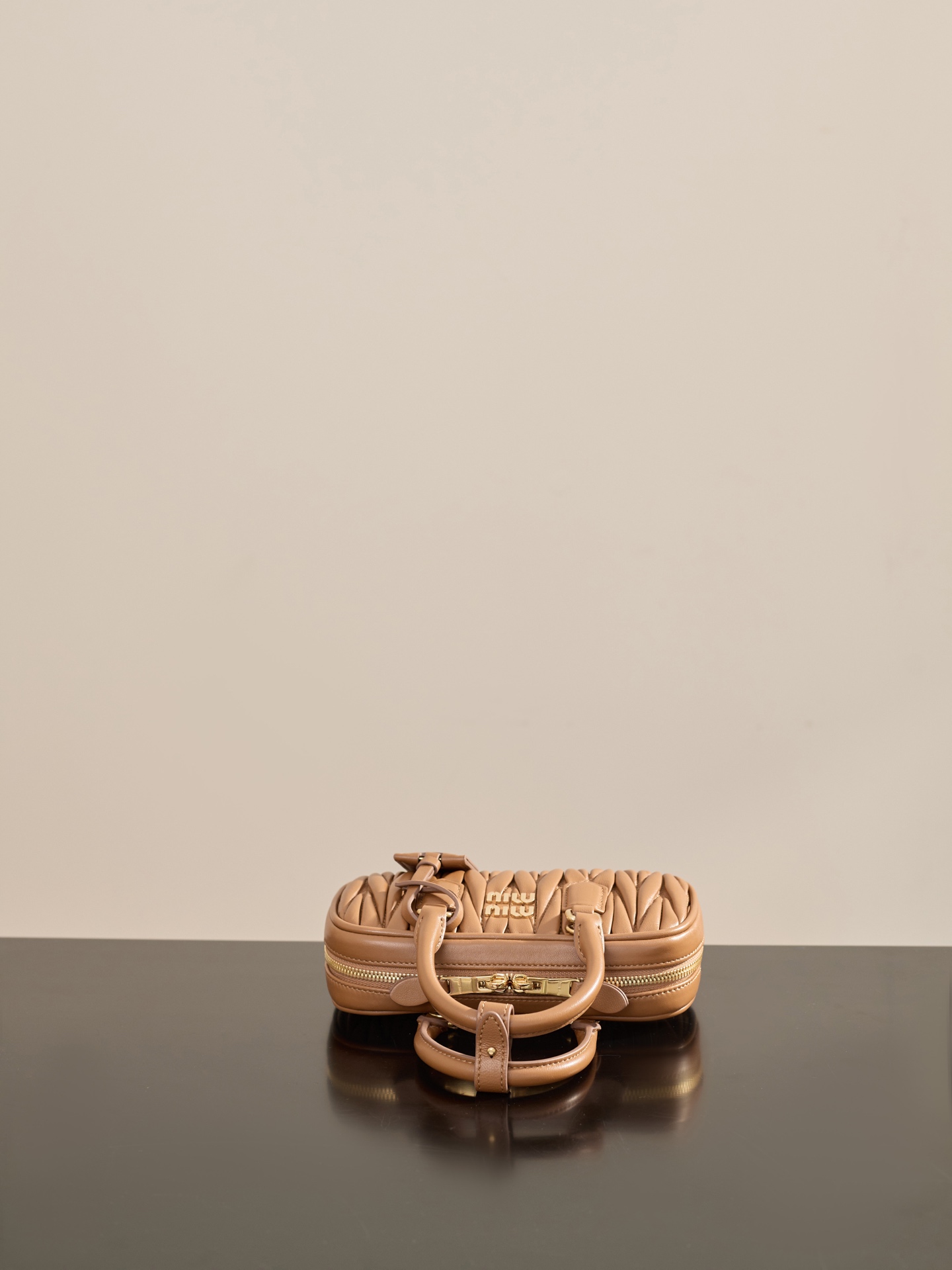 부드러운 양가죽 소재로 제작된 미니 백입니다. 고급스러운 카라멜 색상과 입체적인 주름 디테일이 매력적입니다.