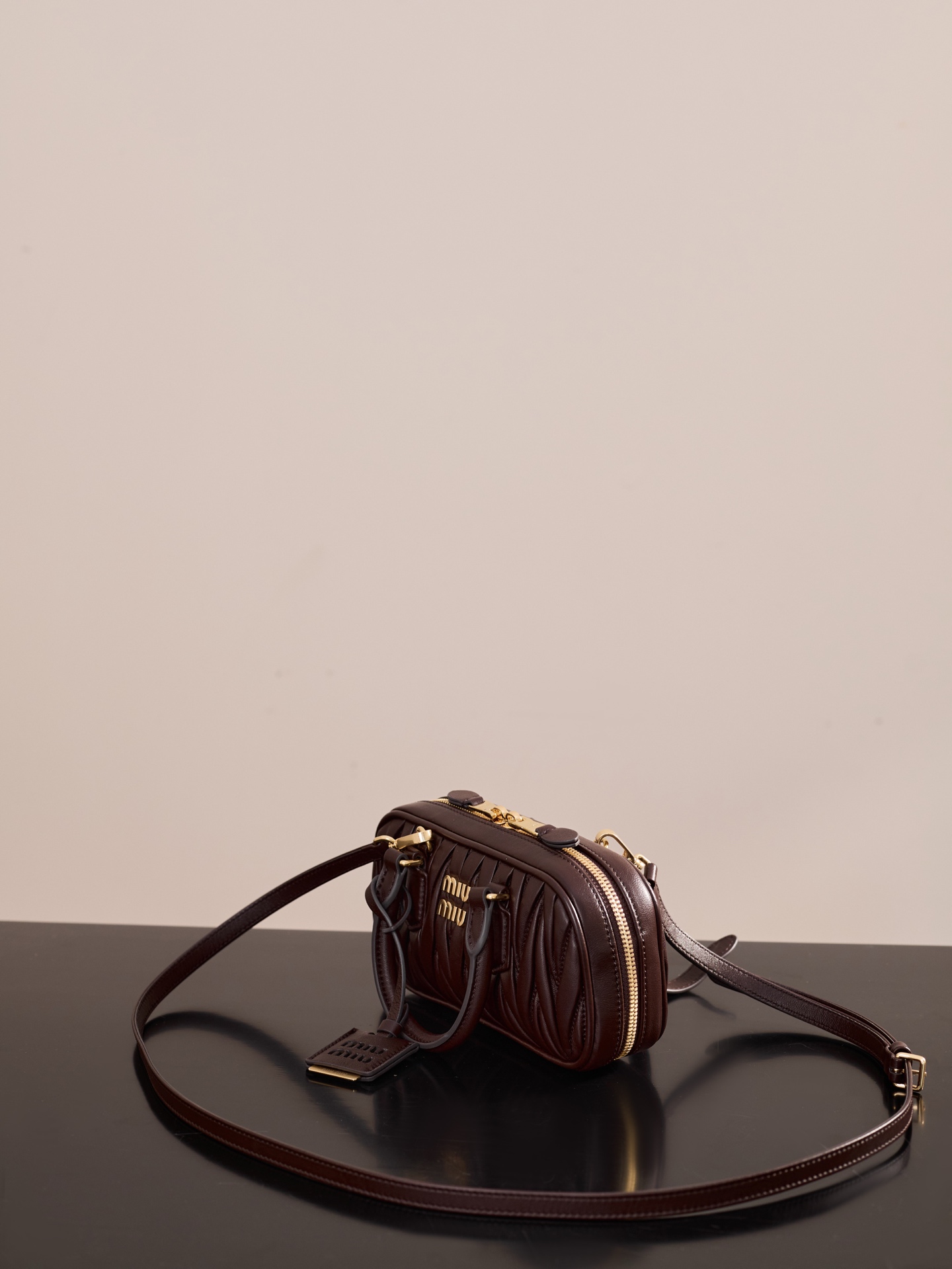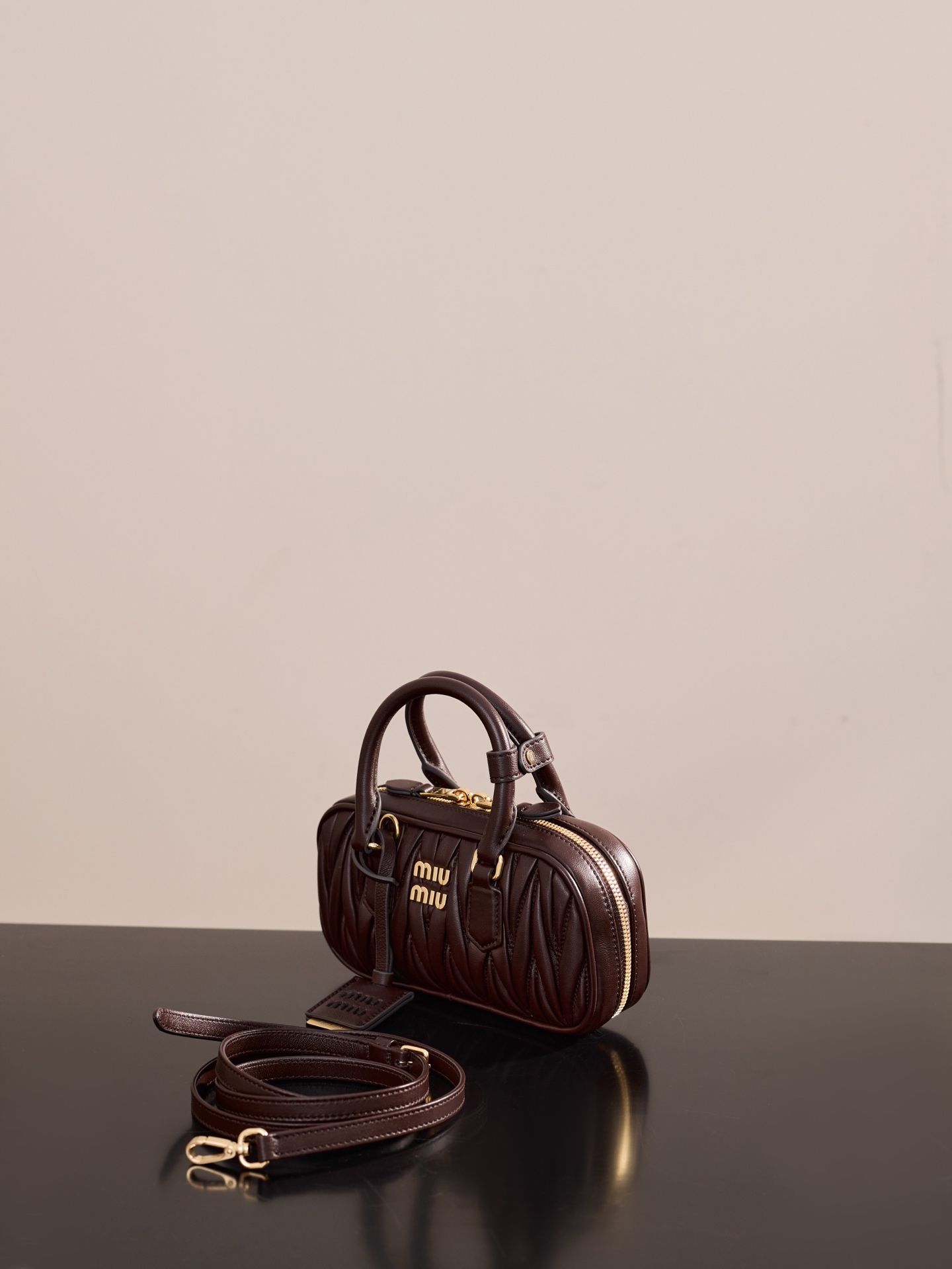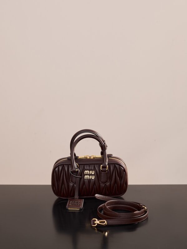 미우미우의 아르카디에 미니 백은 석송색의 부드러운 양가죽으로 제작되었습니다.