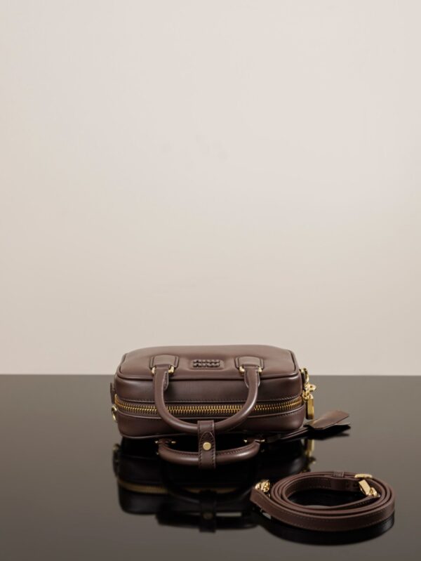 정면의 금속 로고와 빈티지한 하드웨어가 포인트가 되어 세련된 느낌을 더해줍니다. 내부에는 정돈된 수납을 위한 포켓이 있어 실용성을 갖추고 있습니다.