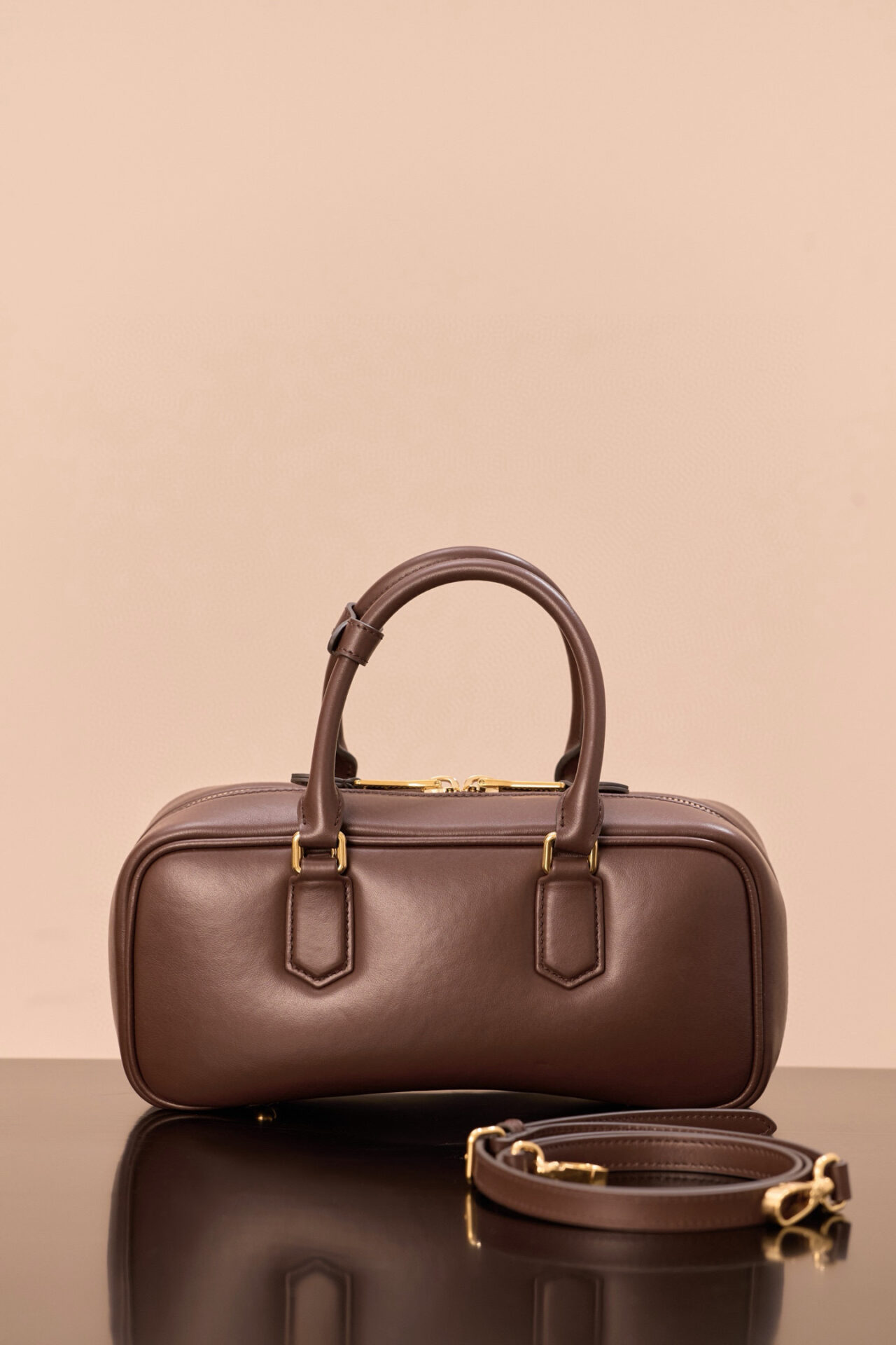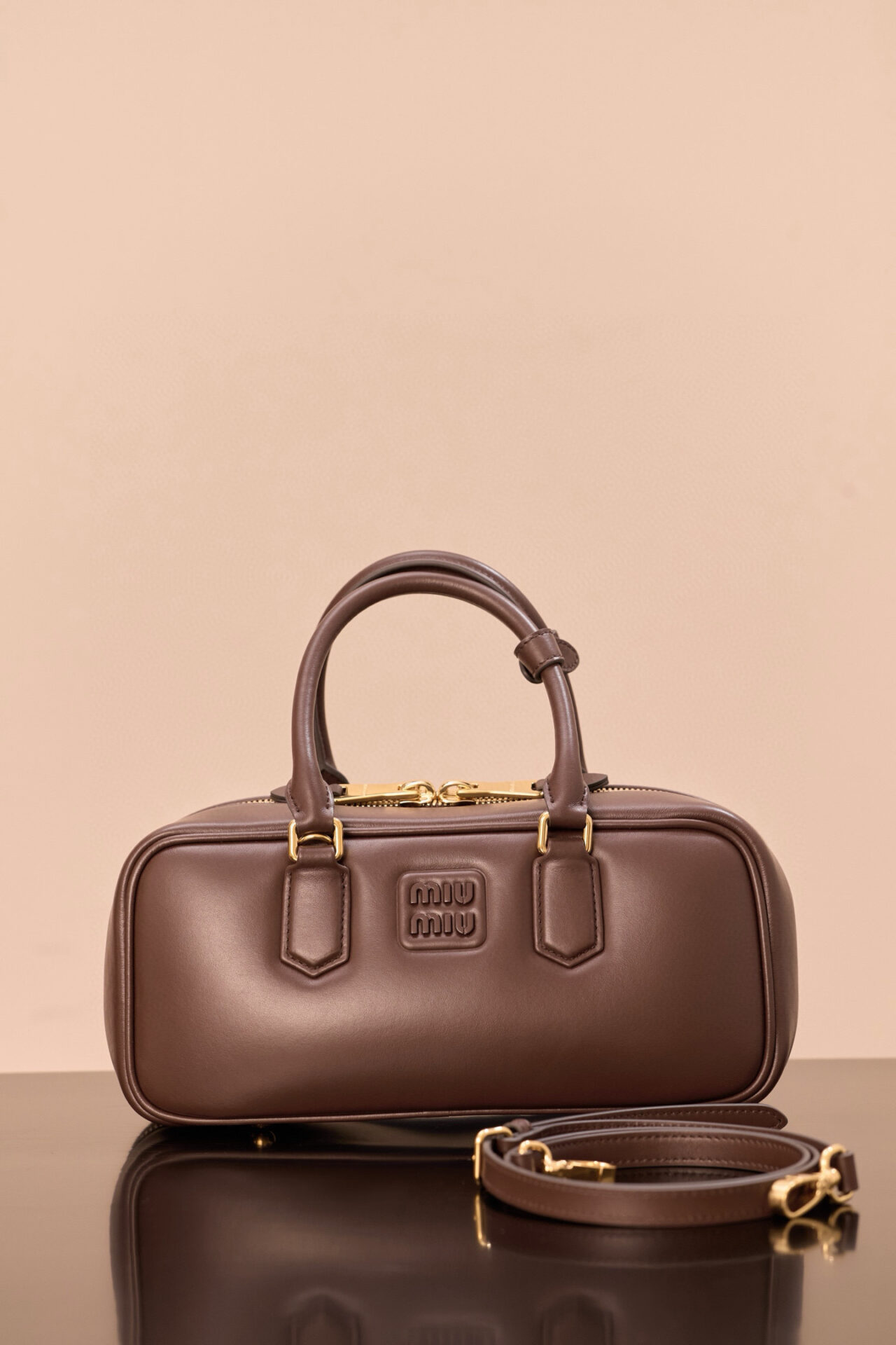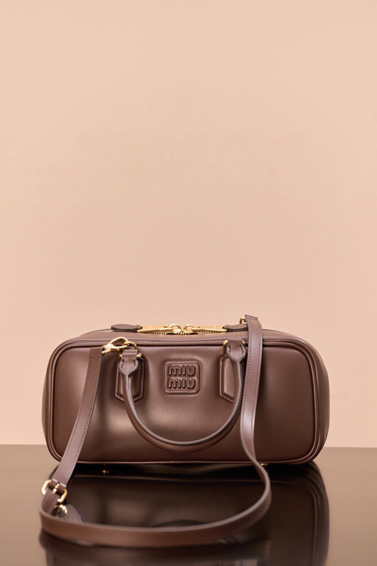부드러운 소가죽으로 제작된 미우미우 아르카디에 백은 세련된 석송색으로 어떤 스타일에도 잘 어울립니다.