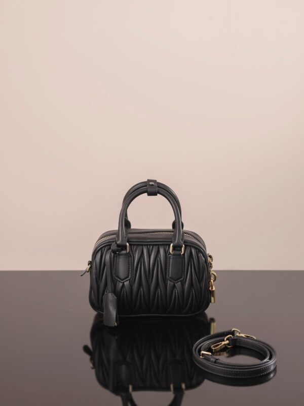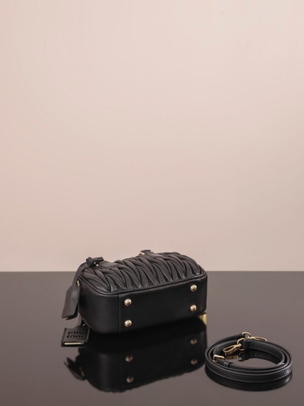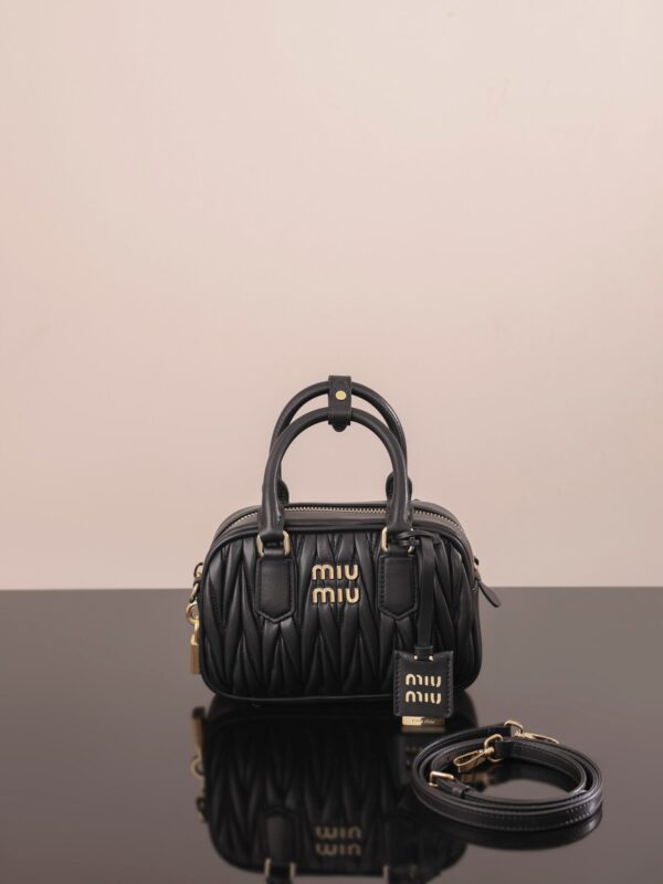부드럽고 탄탄한 양가죽으로 제작된 미우미우 아르카디 메탈라세 핸드백입니다.