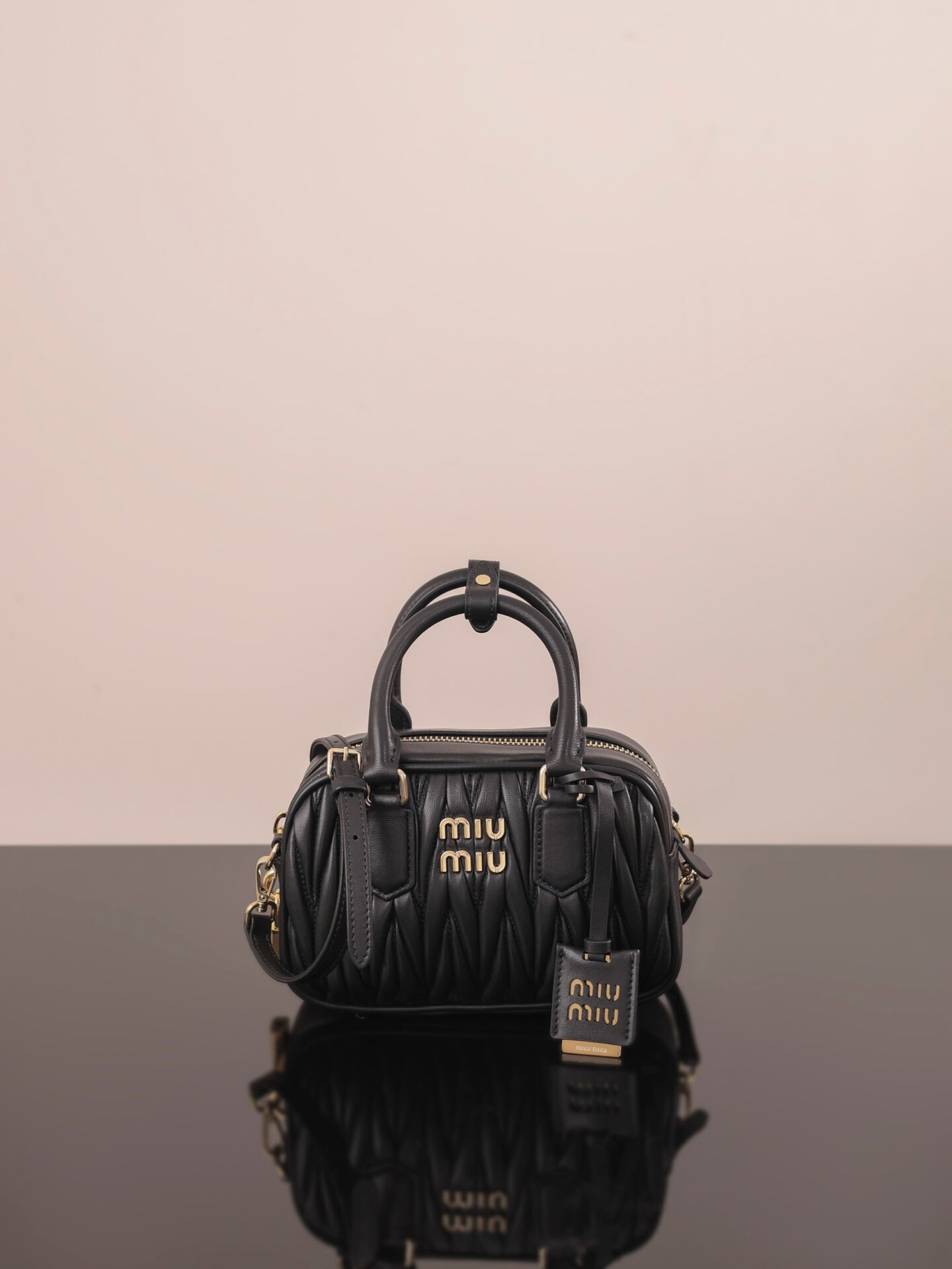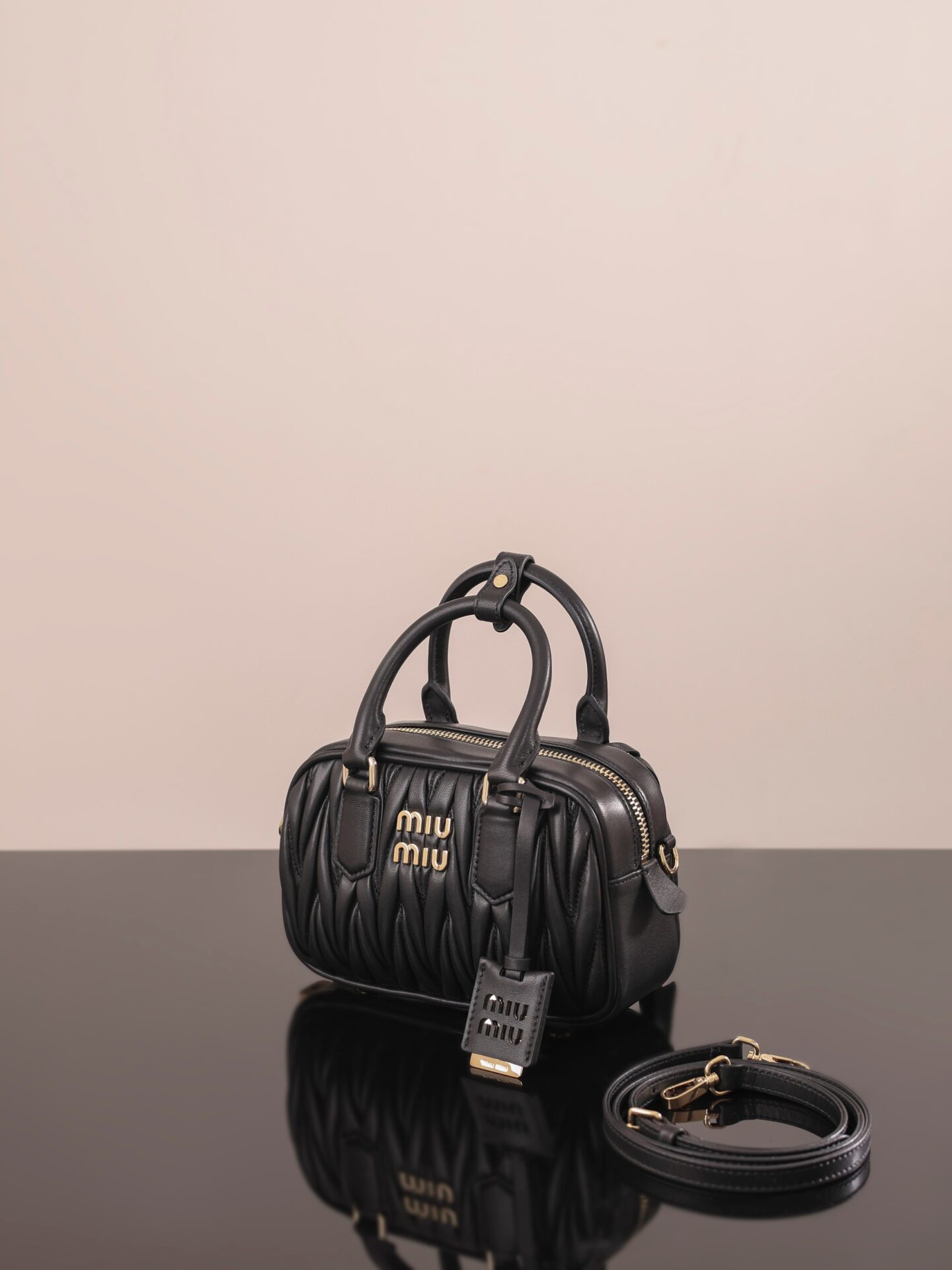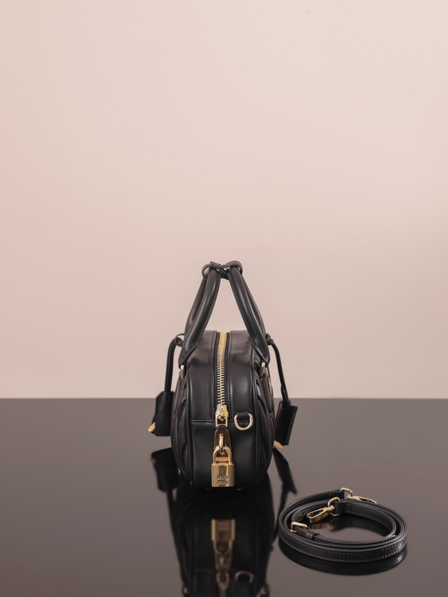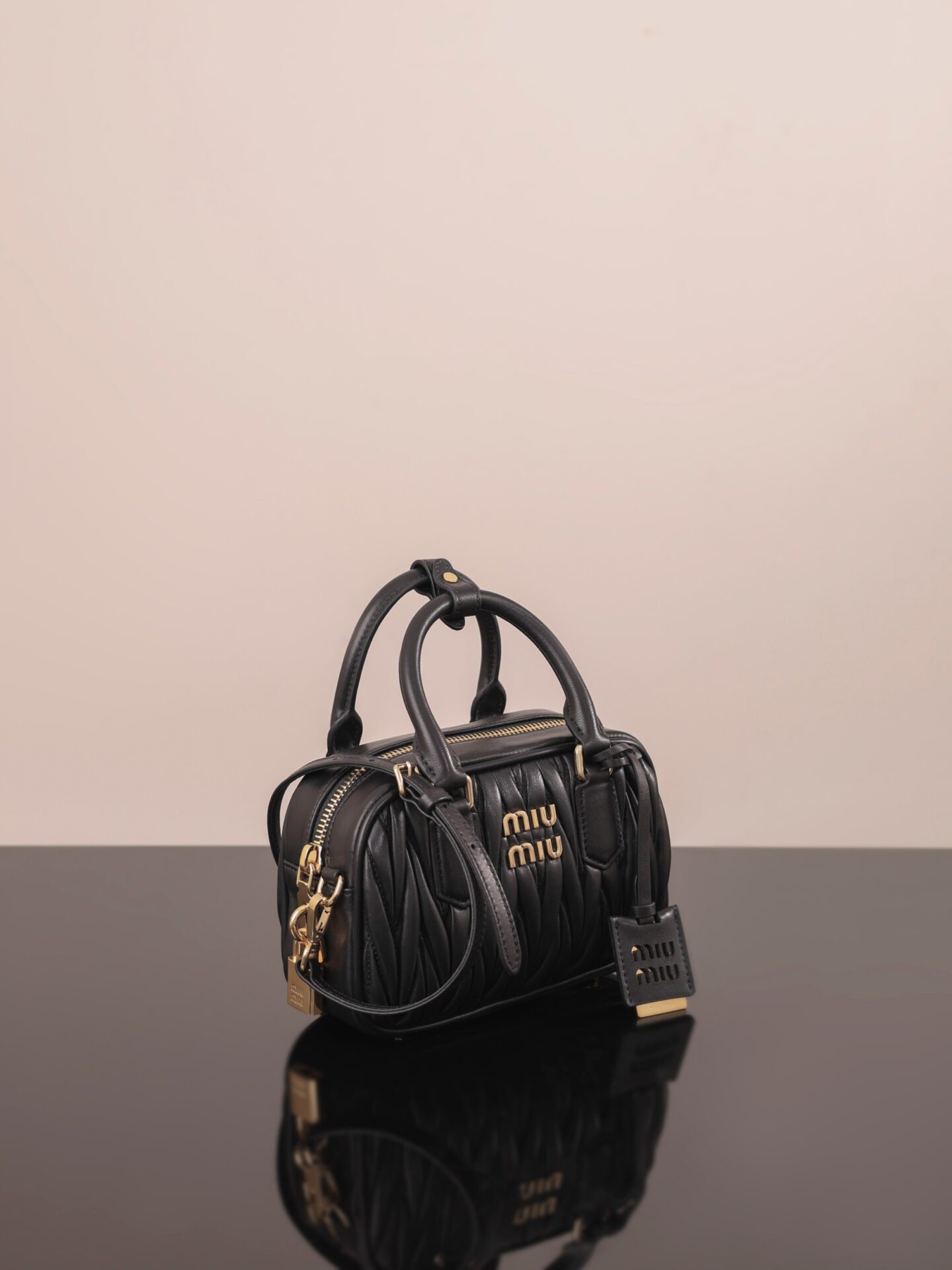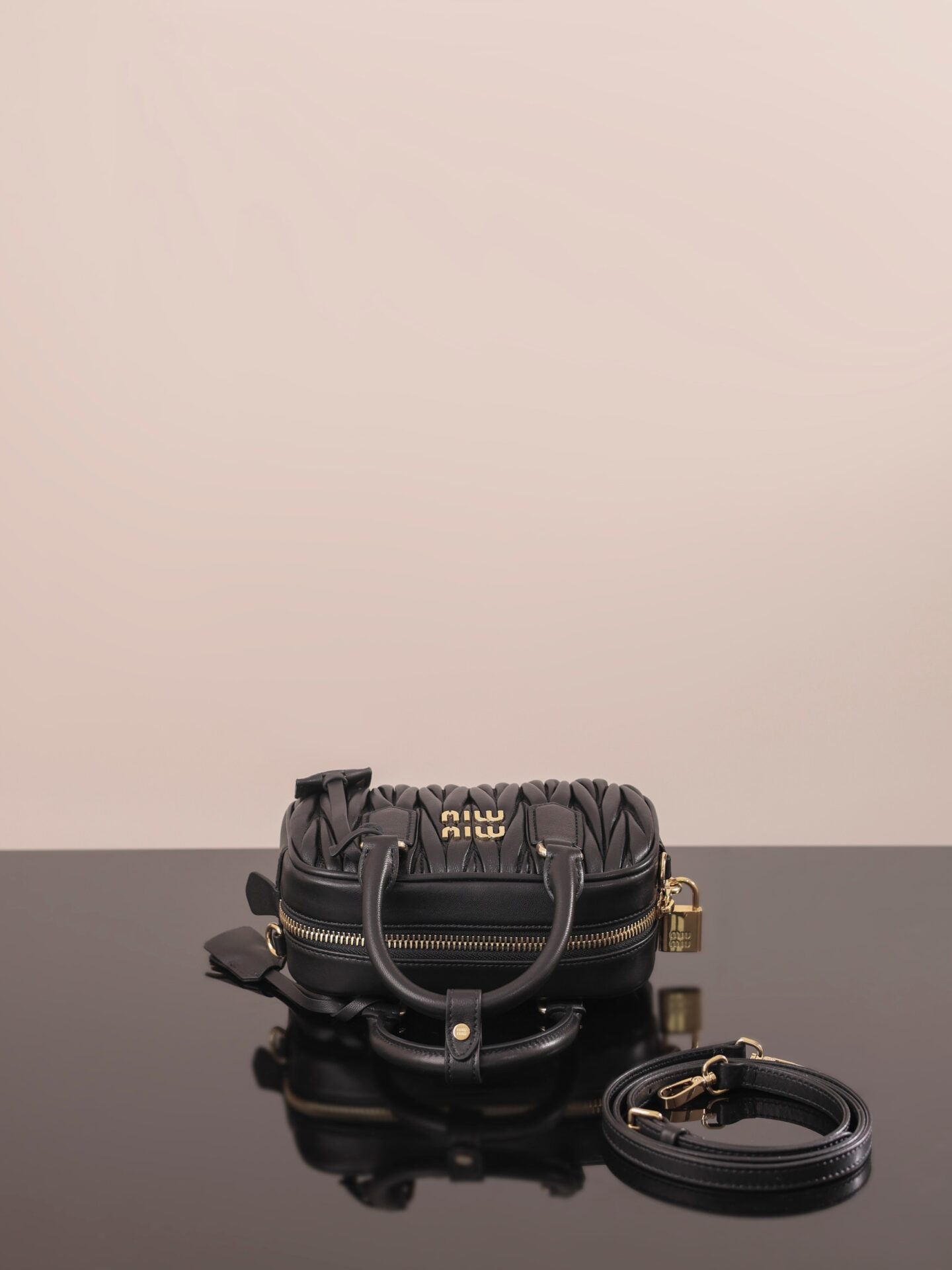 부드럽고 탄탄한 양가죽으로 제작된 미우미우 아르카디 메탈라세 핸드백입니다.