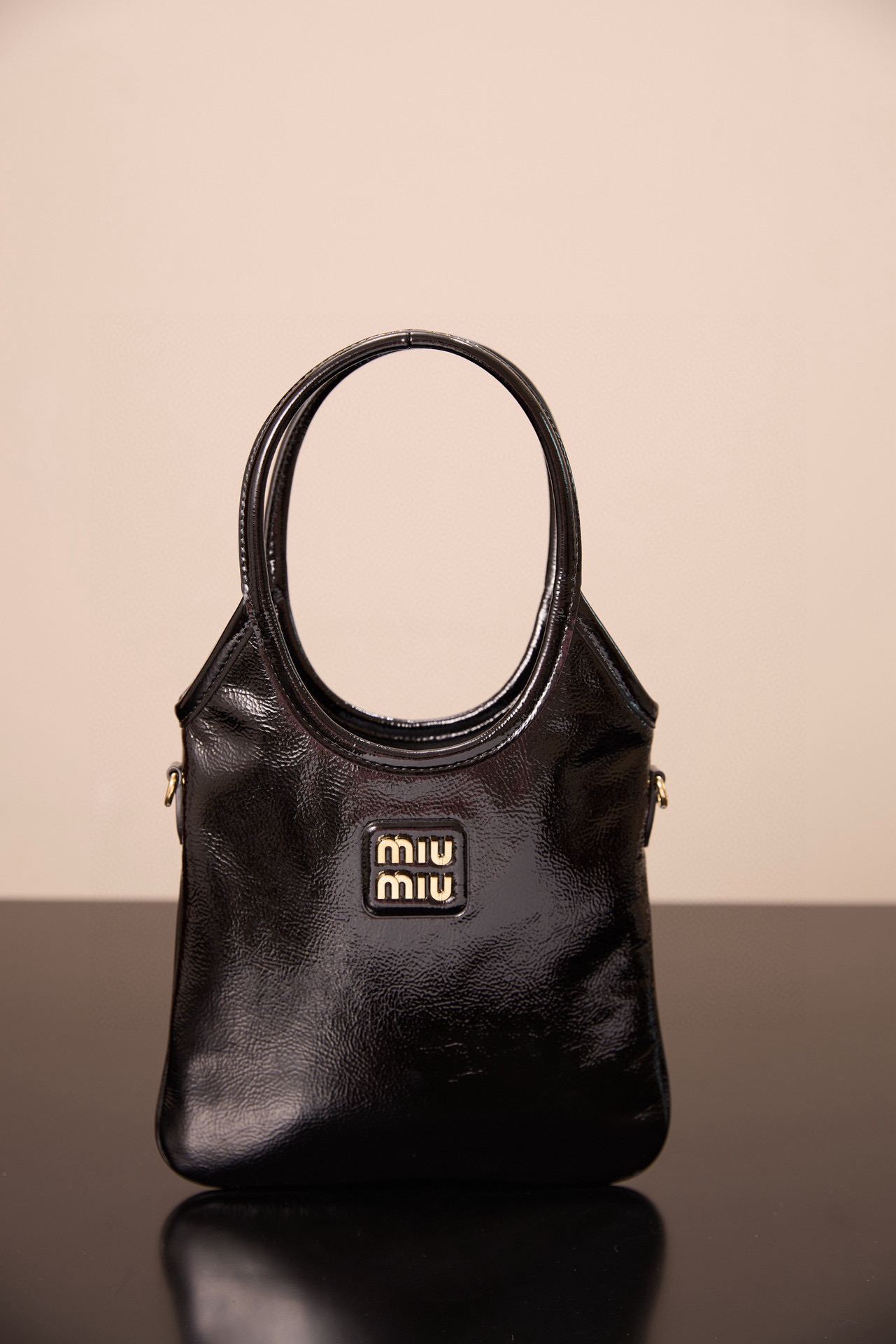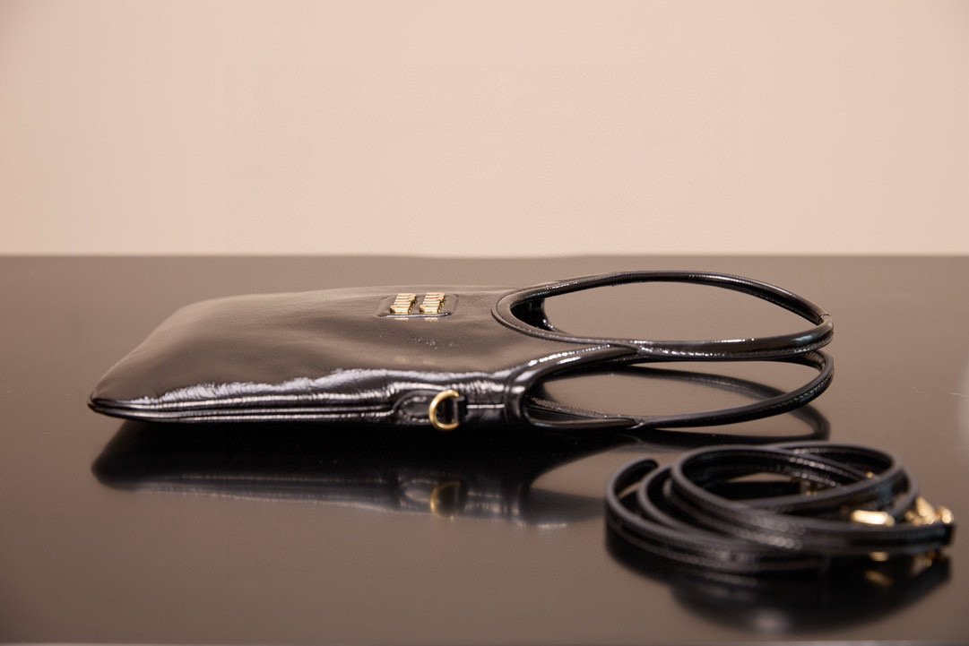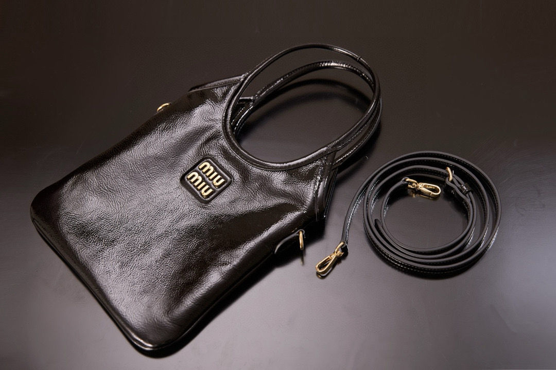 미우미우 아이비 미니백은 고급스러운 유광 가죽으로 제작되어 빛나는 광택이 특징입니다.