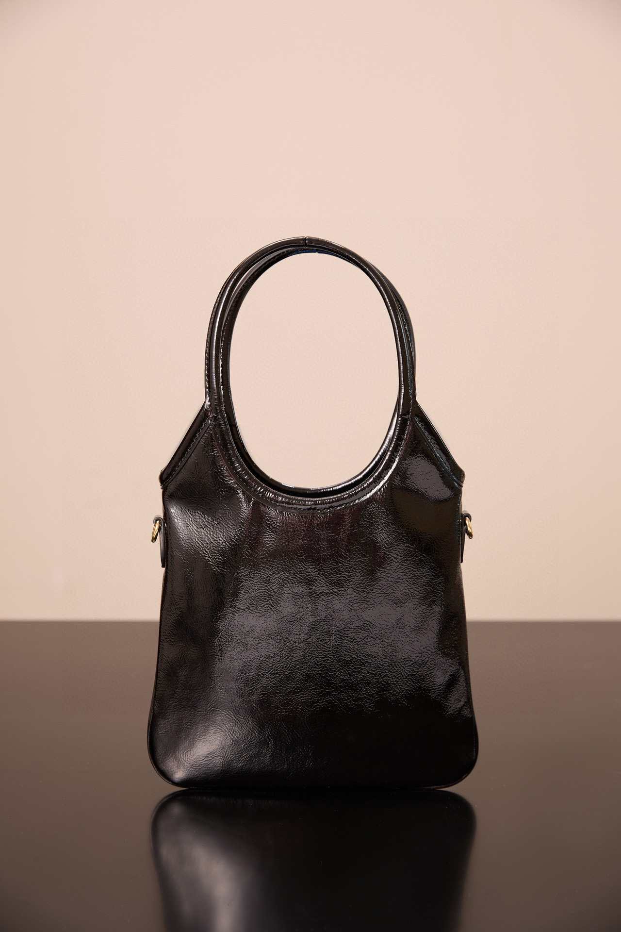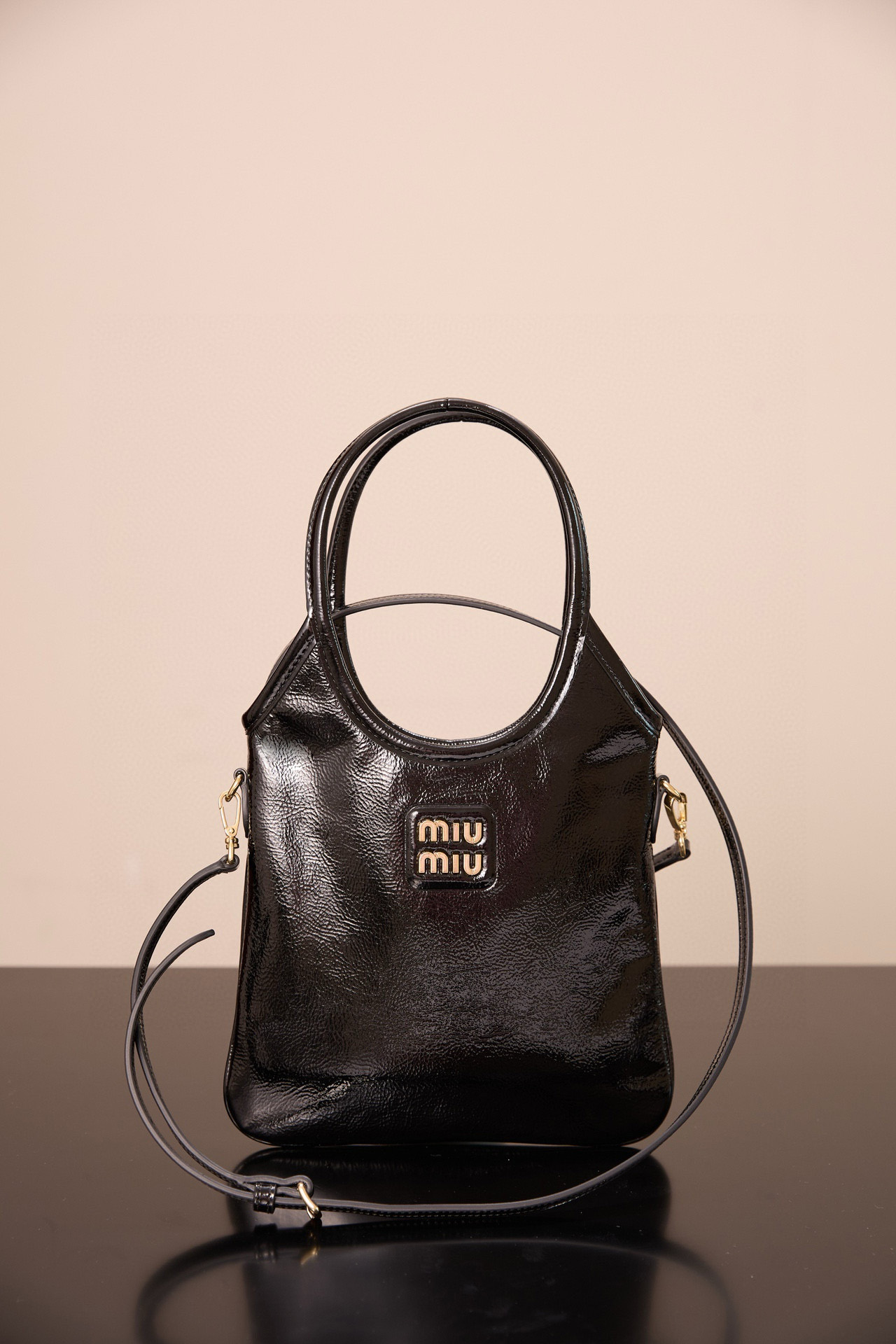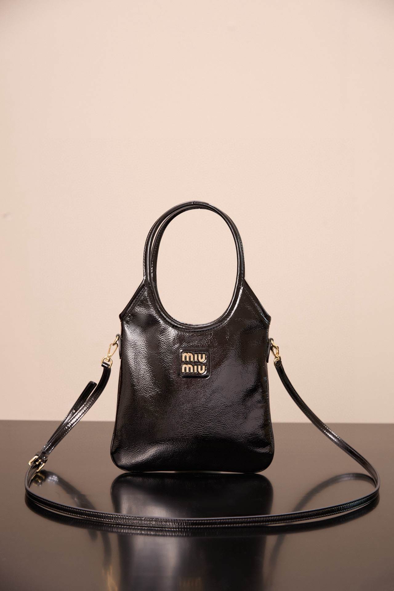미우미우 아이비 미니백은 고급스러운 유광 가죽으로 제작되어 빛나는 광택이 특징입니다.