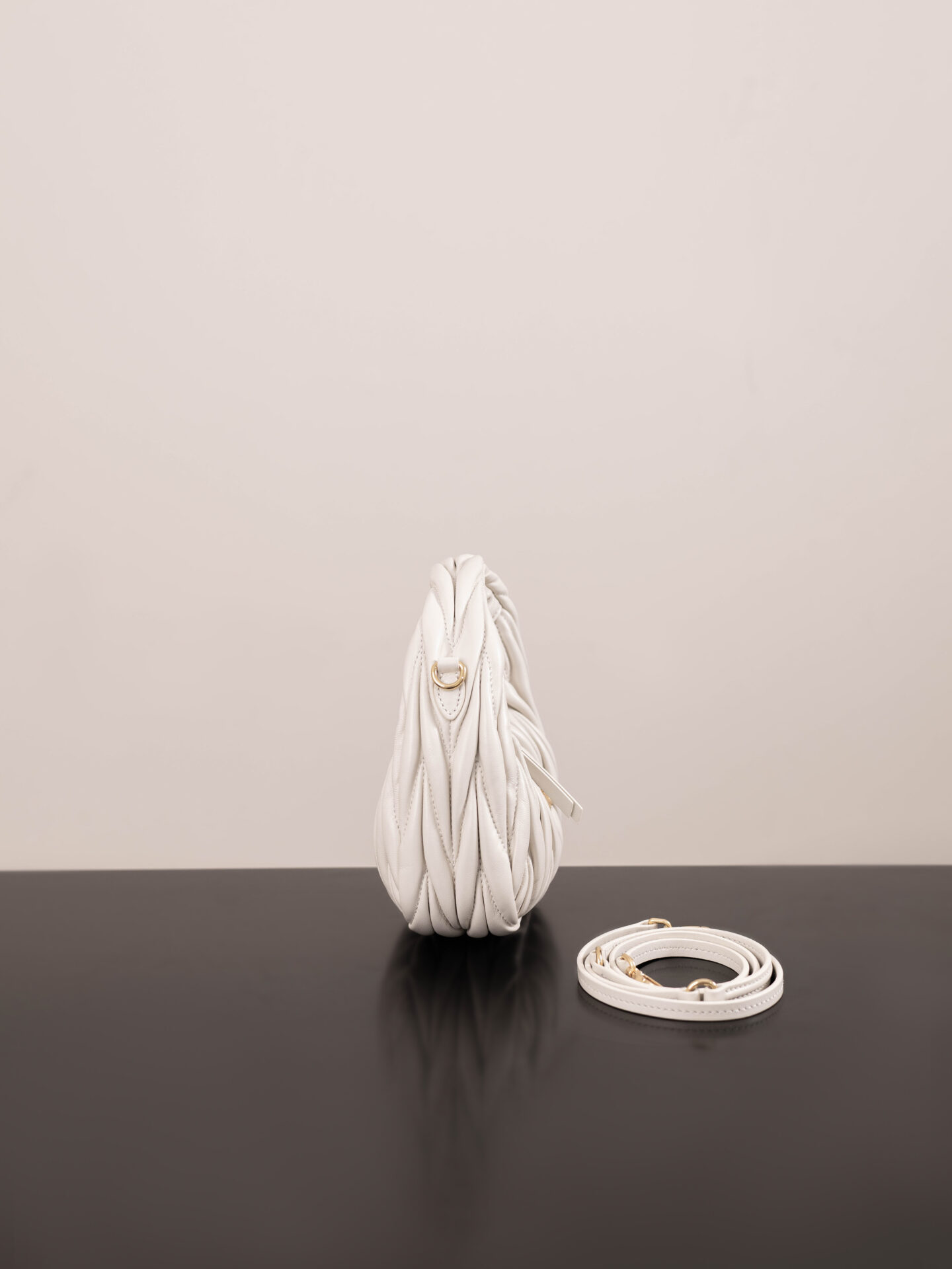 특별한 matelaassé 공법으로 제작되어 독특한 질감을 자랑하며, 110cm 길이의 조절 가능한 어깨끈이 포함되어 있습니다.