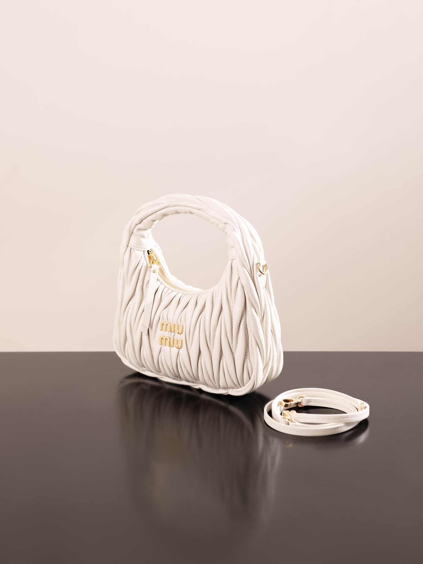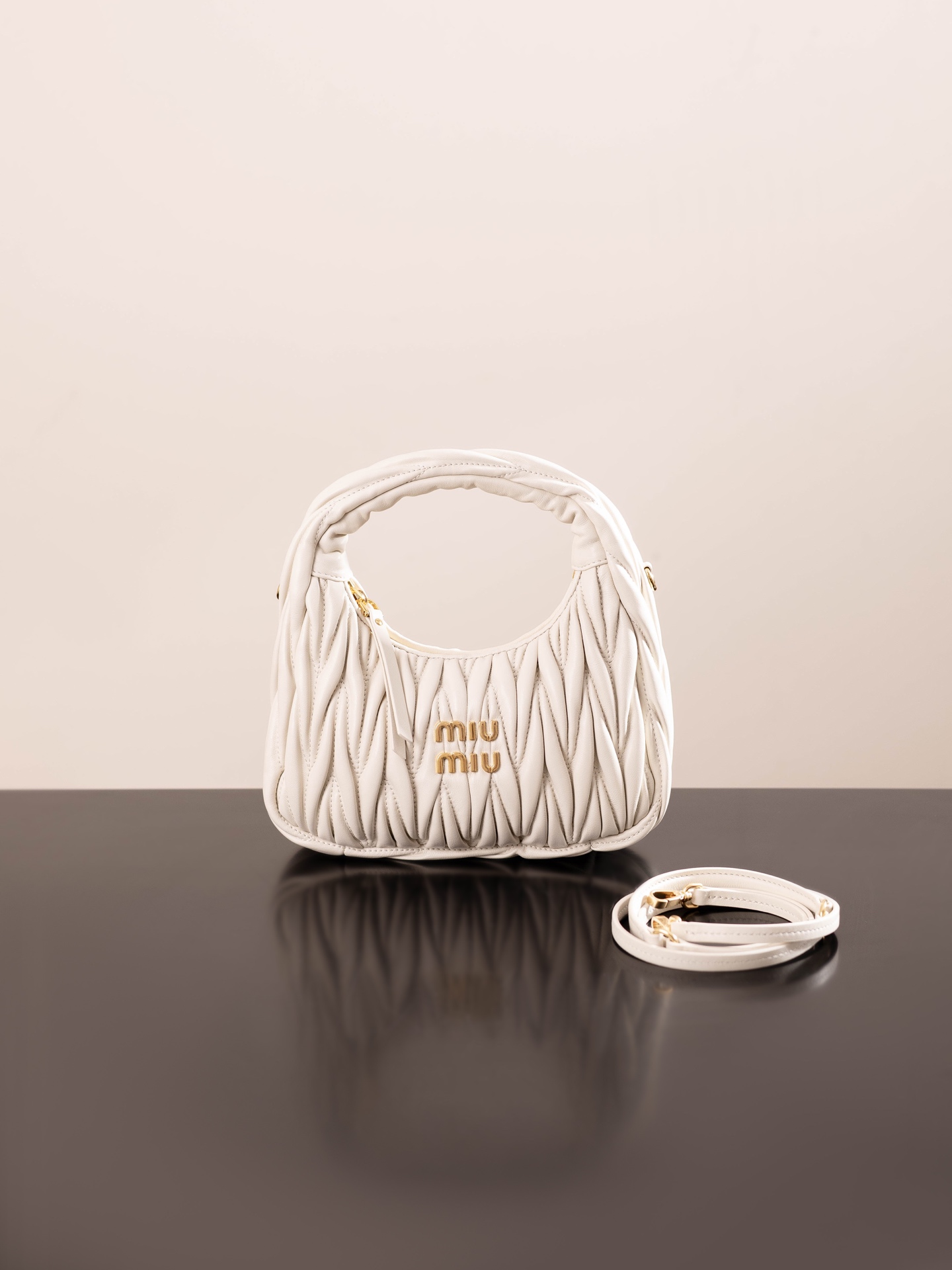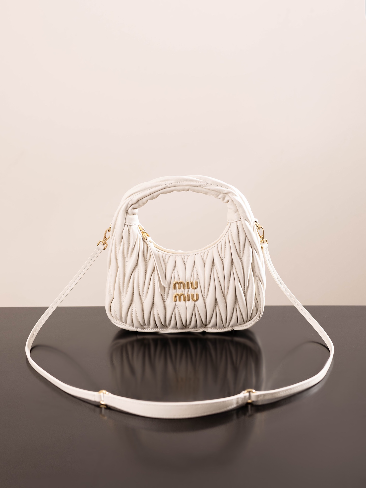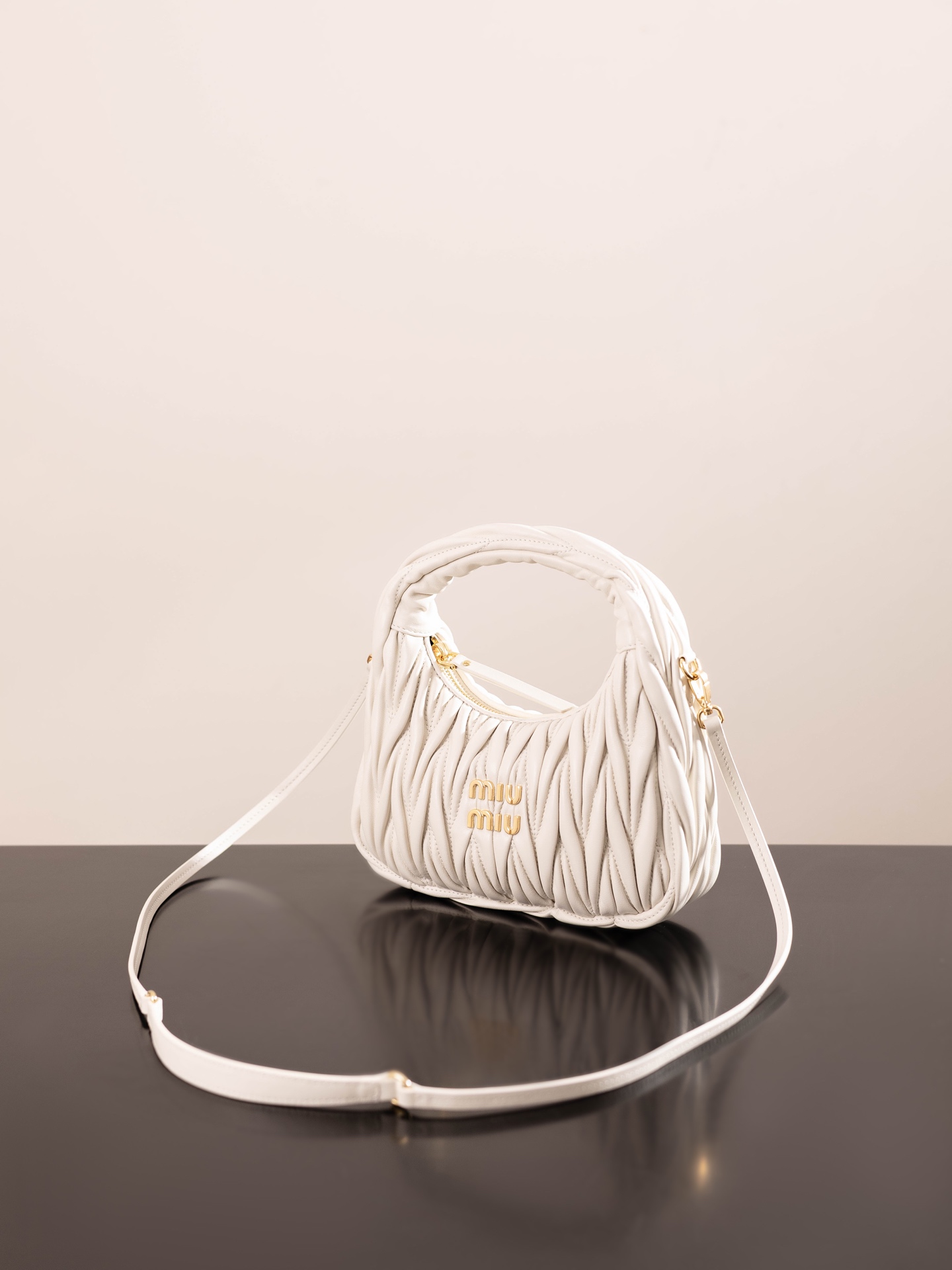 미우미우의 완더 호보 소형 백은 정교한 공예로 입체적인 효과를 자랑합니다.